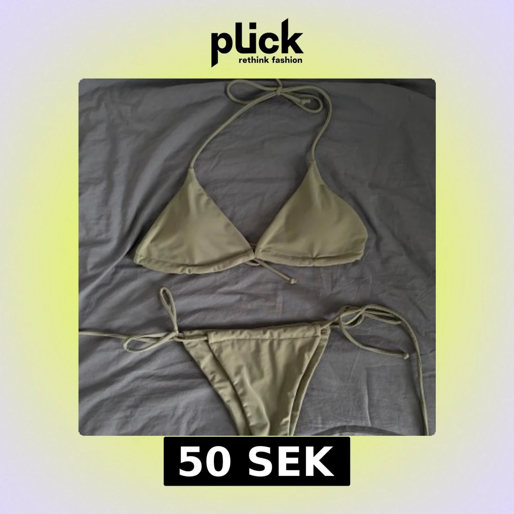Snygg khaki/olivgrön triangelbikini med knyt både i ryggen och på sidorna av underdelen (Färgen stämmer bäst överens med första bilden). Endast testad men säljs då den inte passade. Storlek S men passar troligtvis M också. Överdelen år att knyta på flera sätt. Mycket bra skick😊