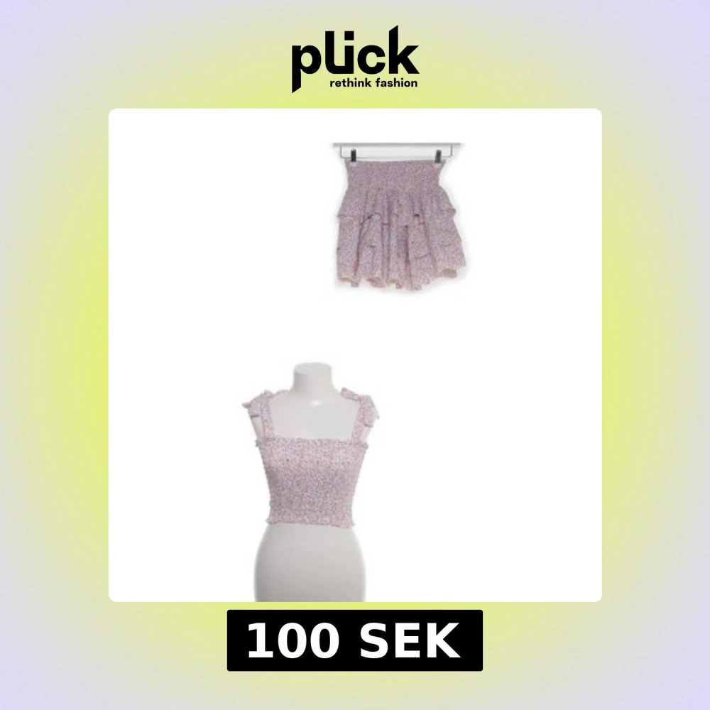 Supersöt kort volangkjol och topp från Defox i blommigt mönster med lila, orange och gröna toner. Kjolen har flera lager volanger och resår i midjan för en bekväm passform. Perfekt för dig som gillar en romantisk och somrig stil.