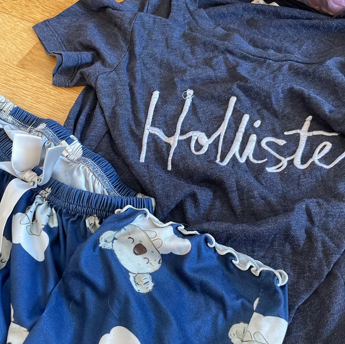 Supersköna blå mjukisbyxor med gulligt koalamönster över hela byxan. Byxorna har resår i midjan och vid bensluten, vilket gör dem extra bekväma. Materialet är mjukt och stretchigt, tillverkat av 95% polyester och 5% elastan. Perfekta för chill hemma eller sleepover. Tröjan är i XS. Gjort av ett mjukt material passar perfekt till byxorna