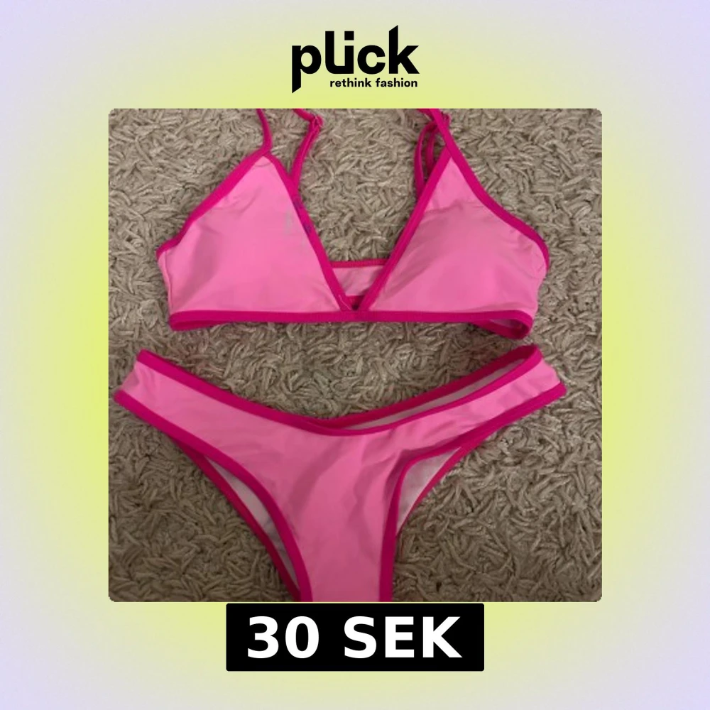 Snygg rosa bikini med mörkare rosa kontrastkanter. Toppen har justerbara axelband och en enkel design. Perfekt för sommarens stranddagar! Den har lyckats få en fläck som man kan se mer på bild 2. Vet ej om det går att ta bort där av det låga priset! Aldrig använd. Fraktar endast varan och köparen betalar frakten! Priset som syns är det som gäller🫶🙏