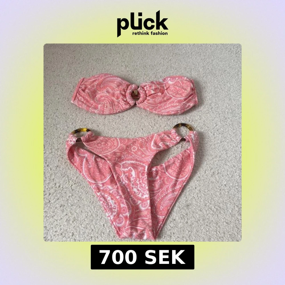 Säljer en snygg rosa bandeau bikini med paisleymönster och guldfärgade ringdetaljer både på toppen och trosan. Bikinin har en feminin och trendig look, perfekt för stranden eller poolen. Materialet är mjukt och stretchigt syntet för bästa komfort.