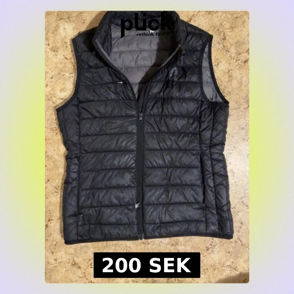 Säljer en svart dunväst i klassisk modell med horisontella sömmar och hög krage. Västen har hel dragkedja framtill och två sidofickor med dragkedja. Perfekt att slänga över en hoodie eller tröja när det är kyligt ute.