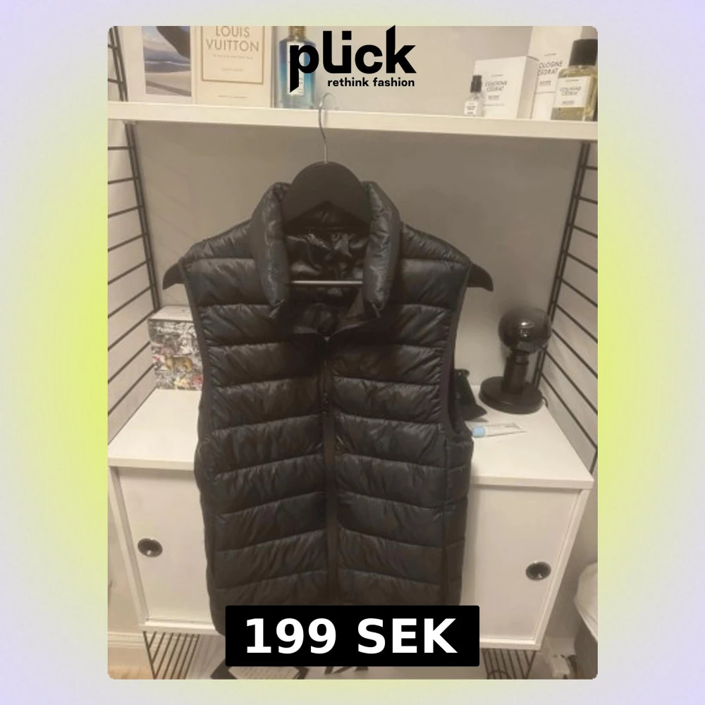 Säljer en svart dunväst med hög krage och horisontella quiltade sömmar. Västen har en stilren look och stängs med dragkedja framtill. Perfekt att slänga över en hoodie eller tröja för extra värme under kyliga dagar.