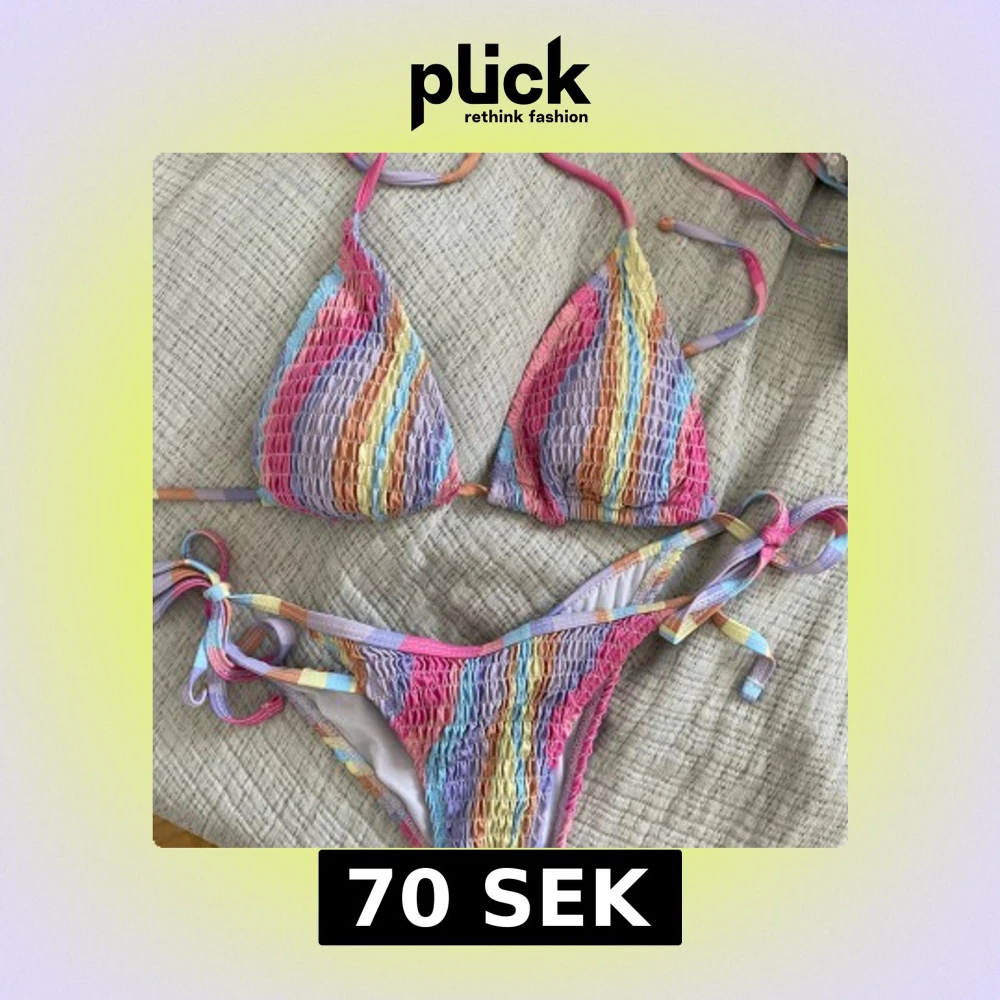Säljer en superfin bikini med färgglada ränder i lila, rosa, blå, gul och orange. Bikinin har trekantsformad överdel och knytband både upptill och på sidorna av underdelen.