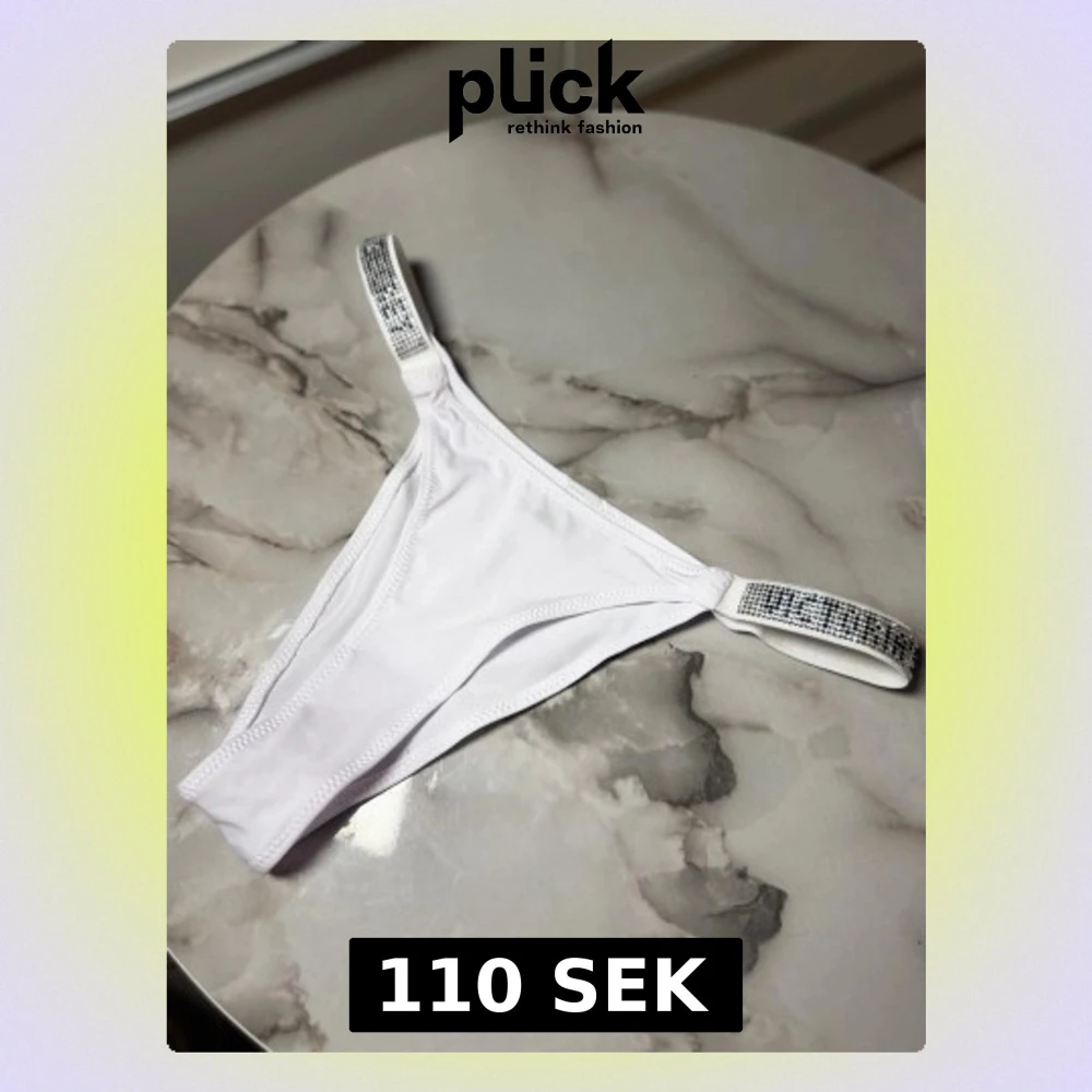 Bilderna visar ett par vita trosor med glittriga band, inte en väst. Ingen väst att beskriva enligt instruktion.