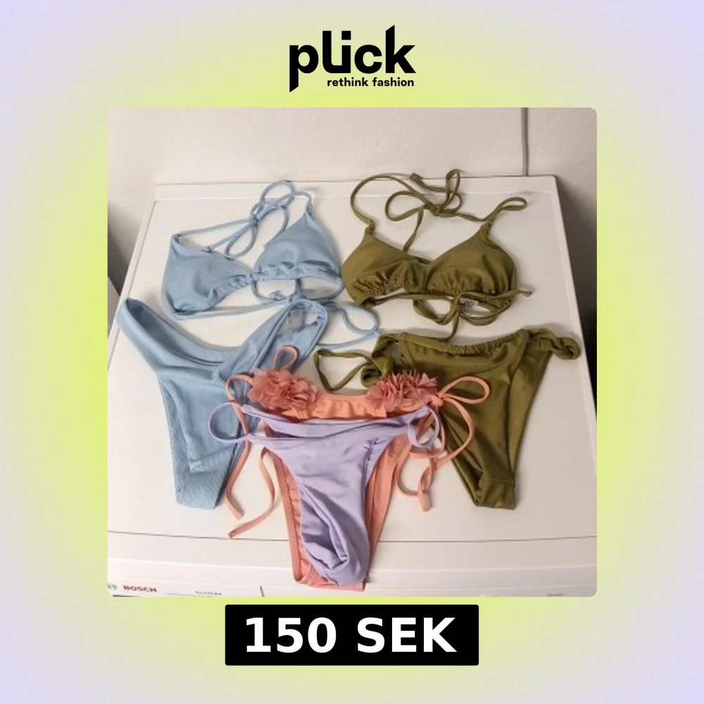 6 snygga bikini-delar: ljusblå ribbad med knyt, olivgrön med snörning, samt en lila och persikofärgad bikini med blommiga detaljer och knyt i sidorna. Perfekta för stranden eller poolen, trendiga färger och feminina former. Köparen betalar frakten.