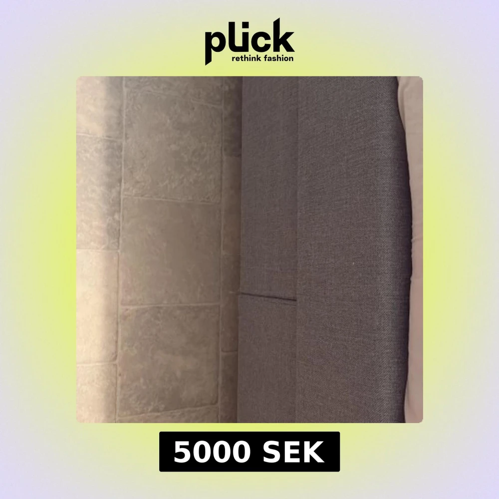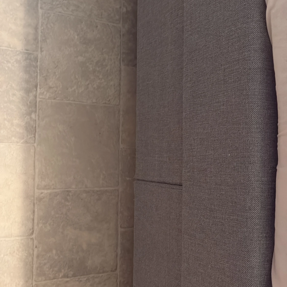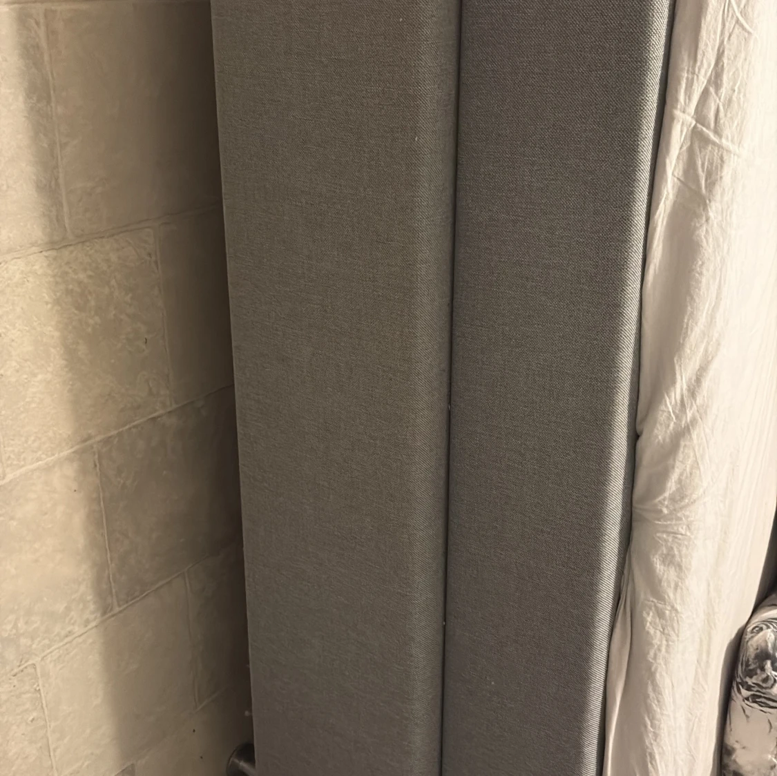 Bilderna visar en möbel, troligen en sänggavel eller soffa, klädd i grått tyg. Ingen elektronik syns på bilderna, och inga synliga märken, modeller eller tekniska specifikationer kan identifieras.