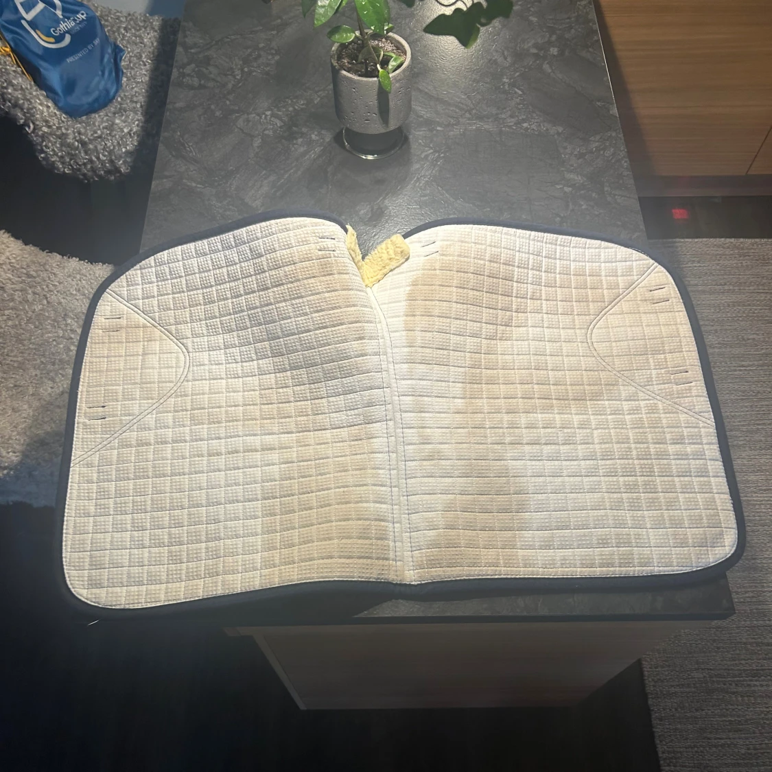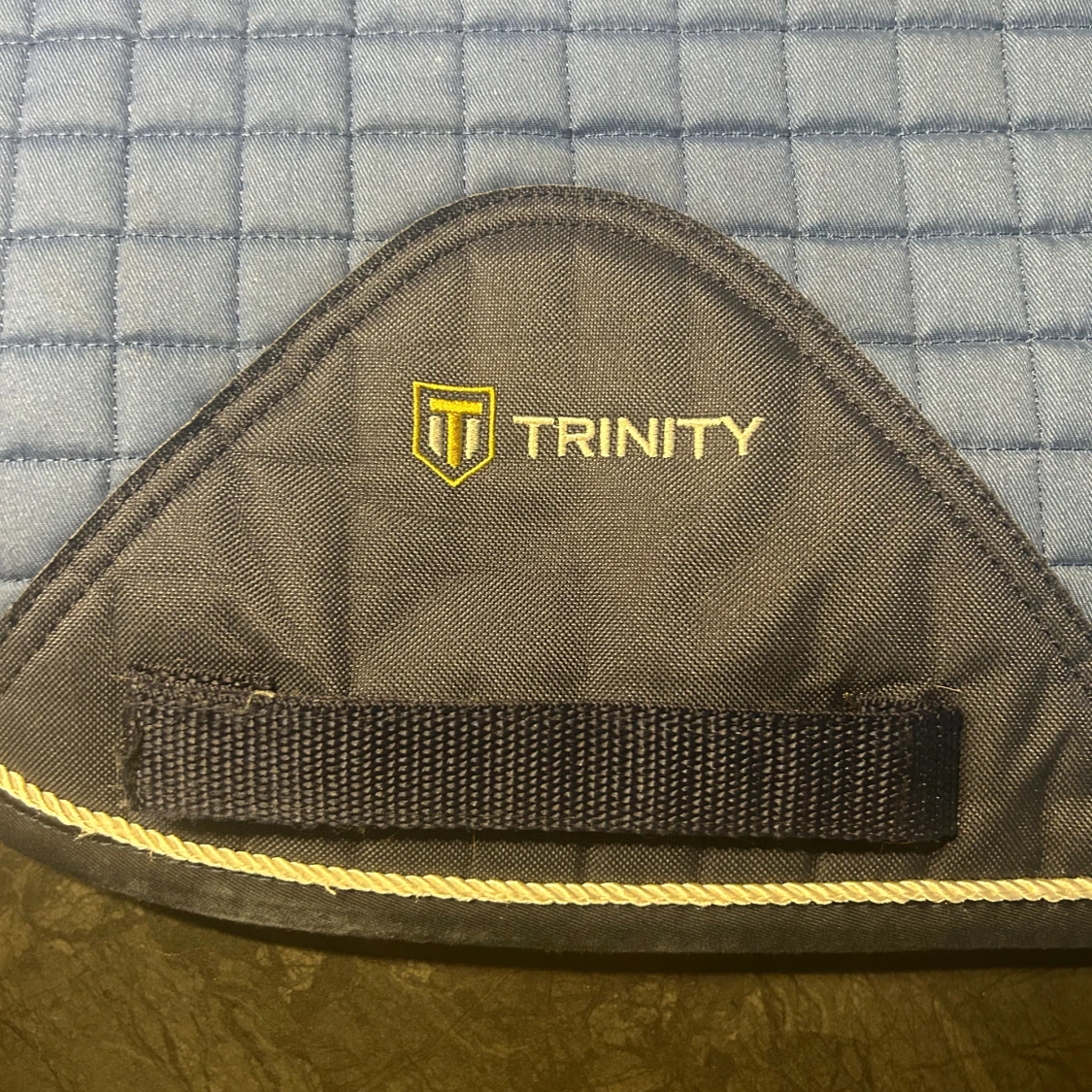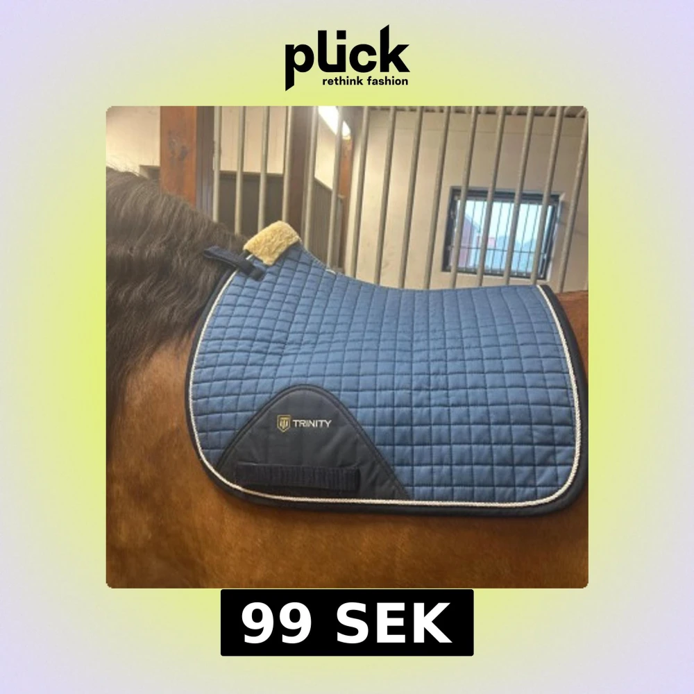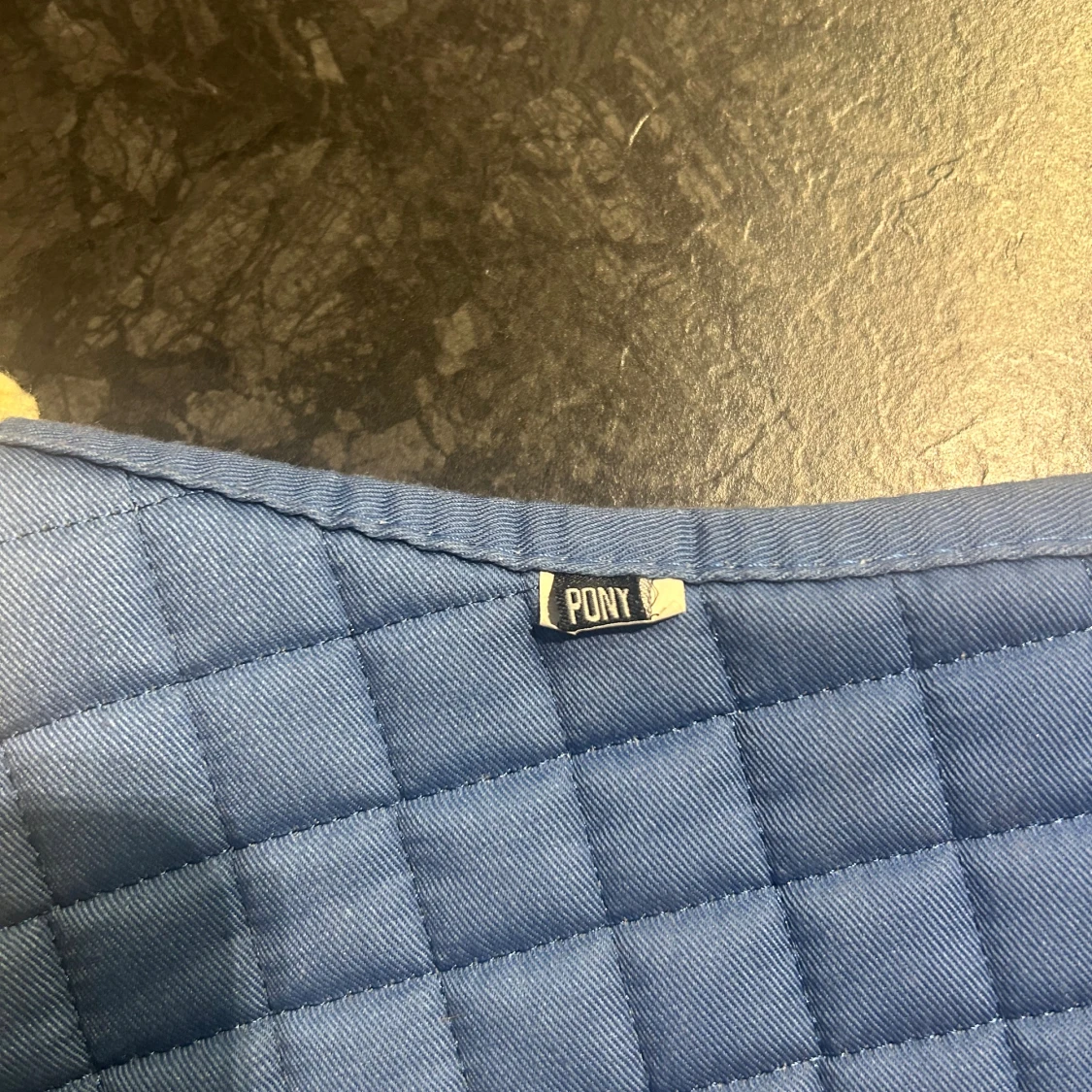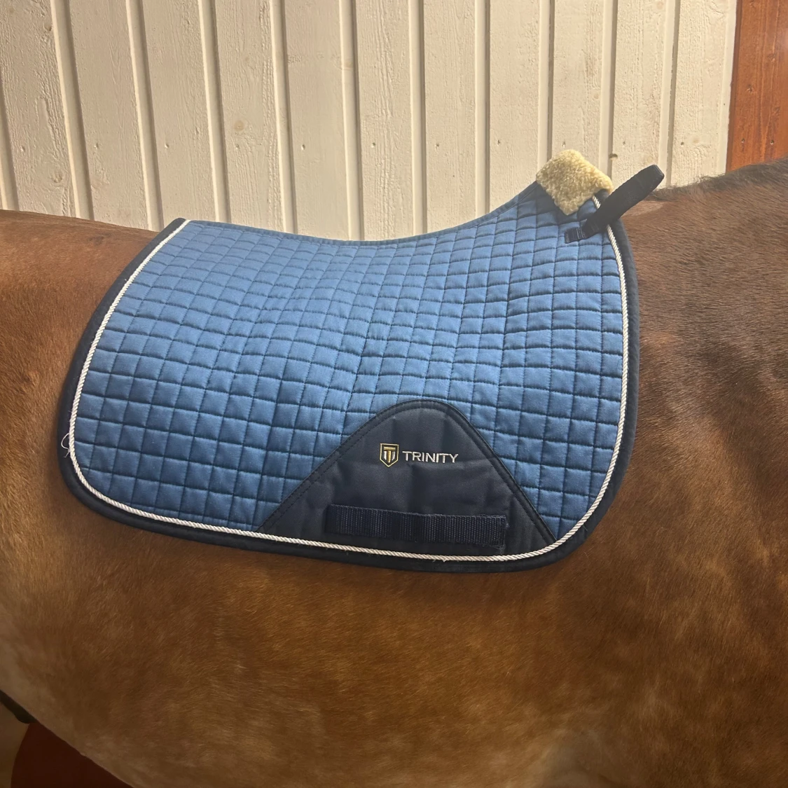 Blått trinity schabrak använt typ 5 gånger och blivit tvättat, tyvärr gick inte dom bruna fläckarna bort men imed att de är vit under sida så blir de ju så. Dressyr modell och har lite fluff framtill och storlek PONNY.