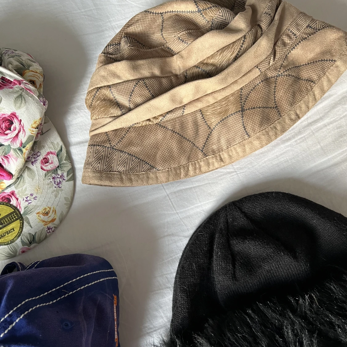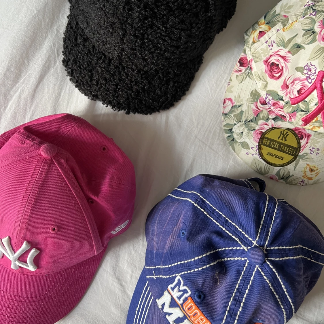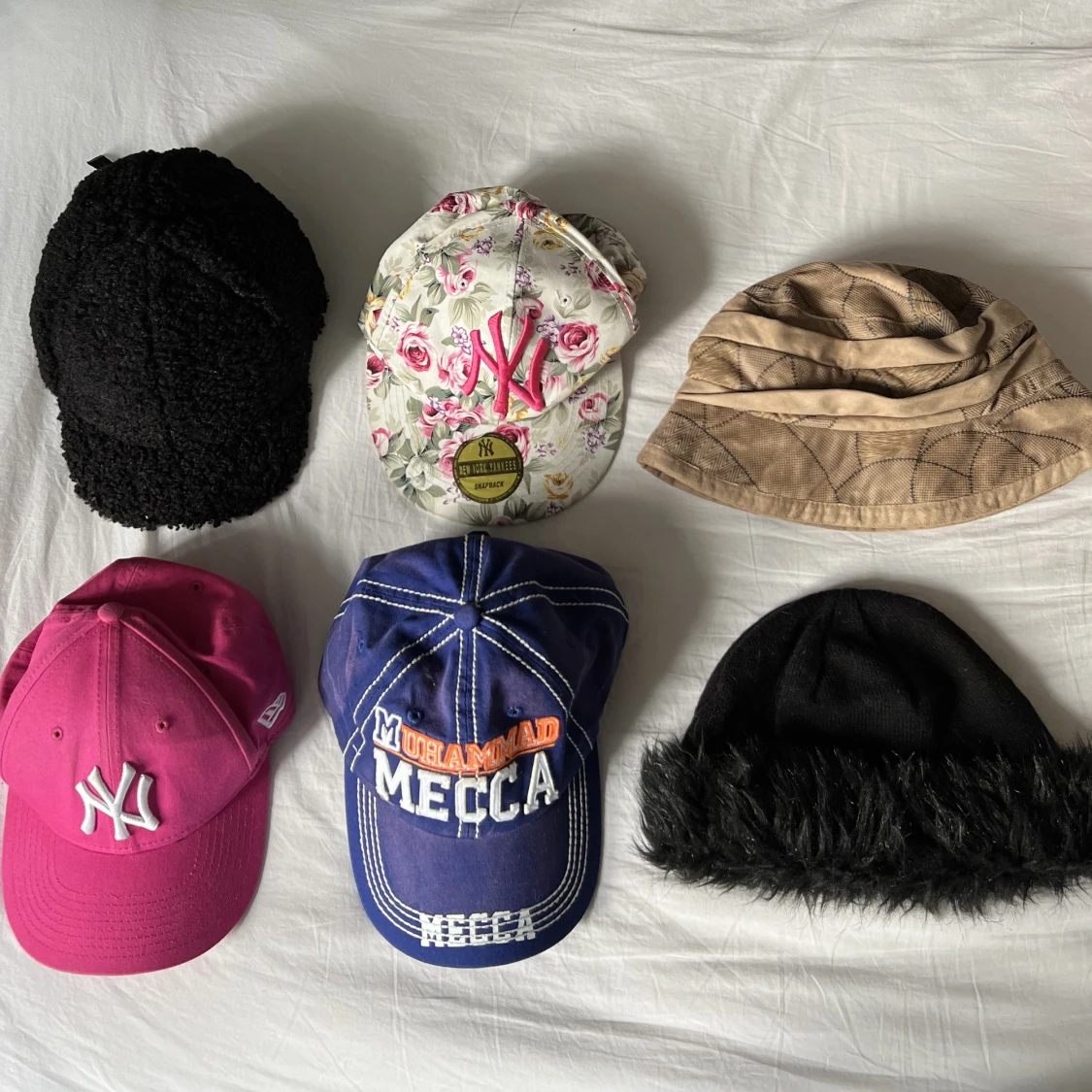 Buckethat, ”One Size”- 60kr 🥀 Mössa med fake päls, ”One Size”- 50kr 🥀 Rosa New York Yankees Keps, Size 54- 50 kr 🥀 Blommig New York Yankees Snap Back ”One Size”- 50 kr 🥀 HM Lurvig Svart Keps, Strl M- 50 kr 🥀 Blå keps, ”One Size”- 50 kr 🥀