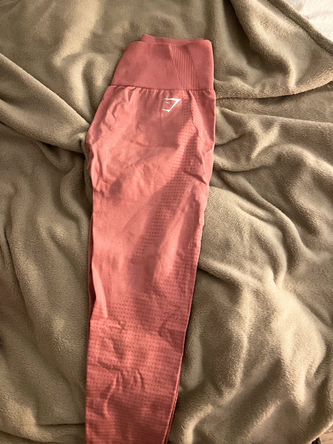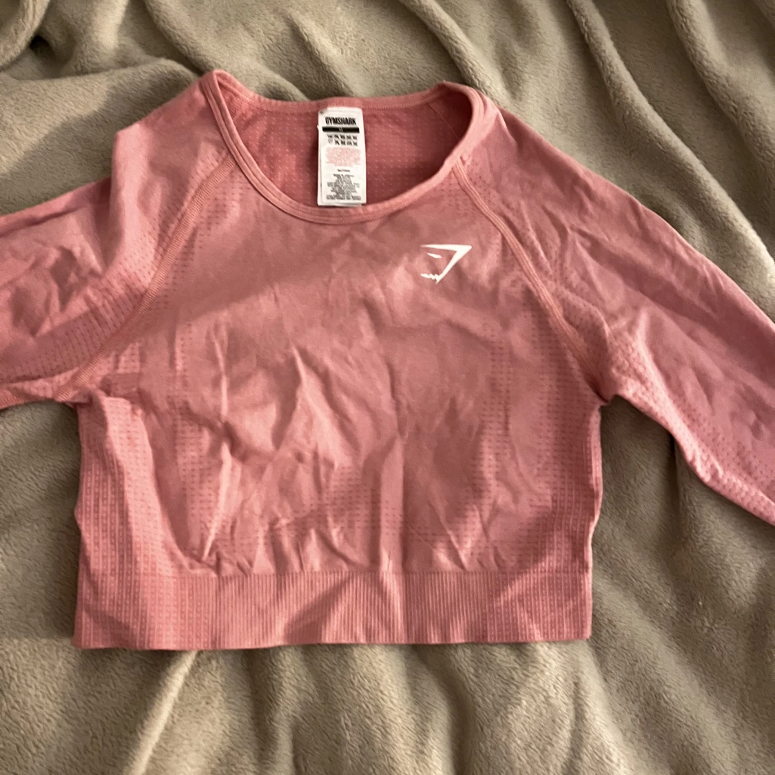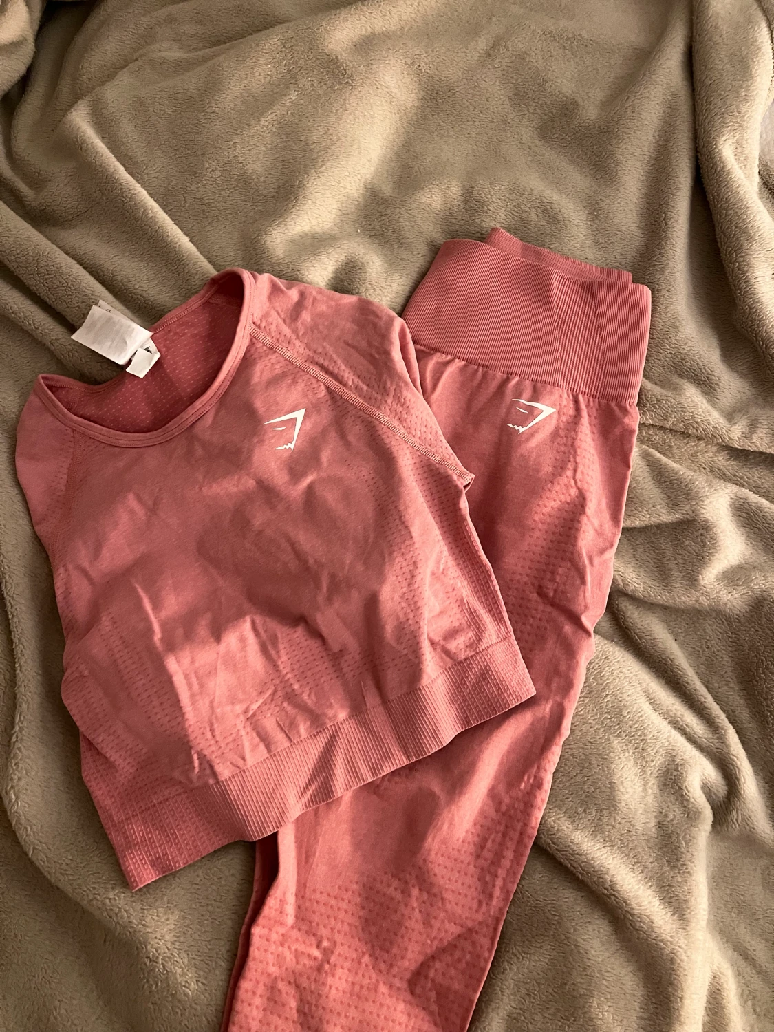 Säljer detta fina set i rosa från Gymshark då jag aldrig använder det. Tröjan och tightsen är båda i strl M och i väldigt fint skick. Tröjan är långärmad och croppad.