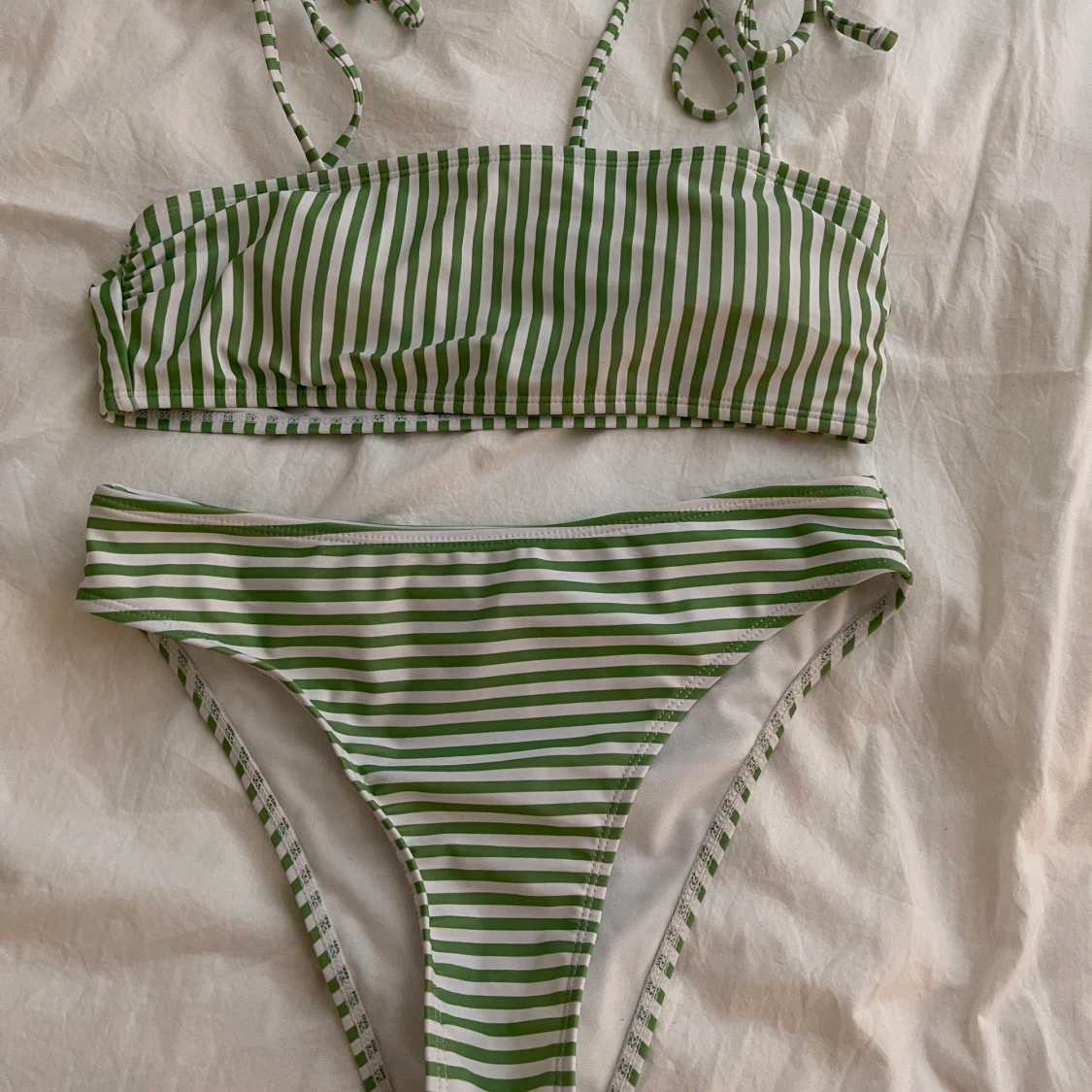 Grön randig bikini från shein, använd endast en gång och super fin. Pris kan alltid diskuteras, och för bild på är det bara att fråga.