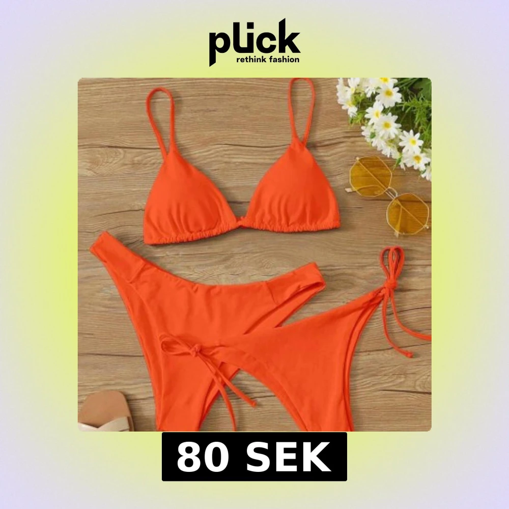Trendig orange bikini med trekantsöverdel och knytband både i ryggen och på sidorna av trosorna. Perfekt för soliga dagar på stranden eller vid poolen. Den starka färgen gör att du sticker ut i mängden! Aldrig använd, storlek XS🧡