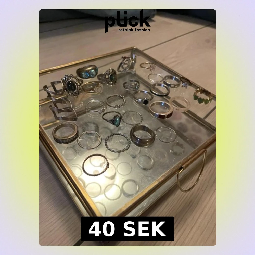 ca 30 blandade ringar, mest lite guldiga men mest silverfärgade. Olika skick o storlekar