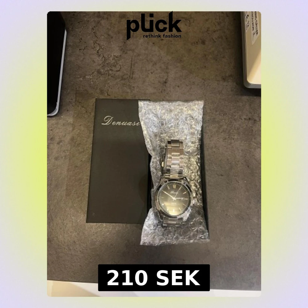 Stilren klocka från Denuasi med rund urtavla i svart och silverfärgat armband i metall. Urtavlan har datumvisning och markerade index, och armbandet är klassiskt länkformat. Perfekt för dig som gillar en clean och modern look.silver klocka aldrig använd- kommer ifrån Gurkis företag som även andra stora kreatörer som krobbe använt den
