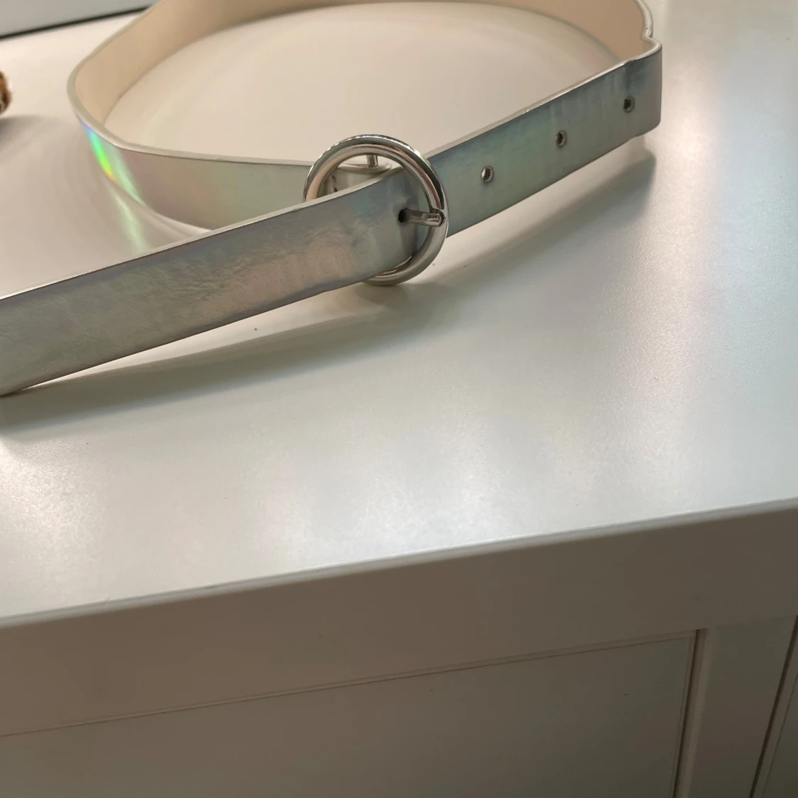 Snyggt bälte i silver från Lindex med ett brett band och ett runt metallspänne. Bältet har en cool, glansig finish som ger en futuristisk vibe. Perfekt accessoar för att lyfta din outfit med lite extra edge.