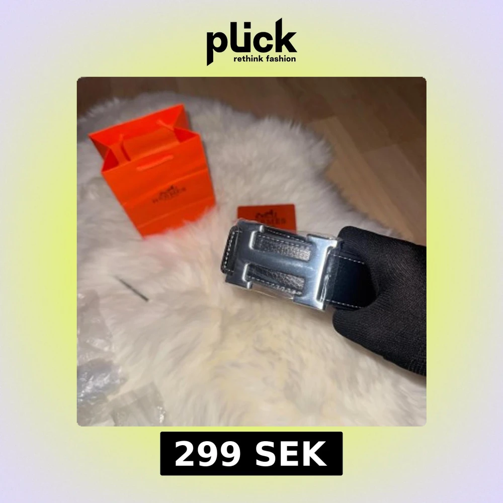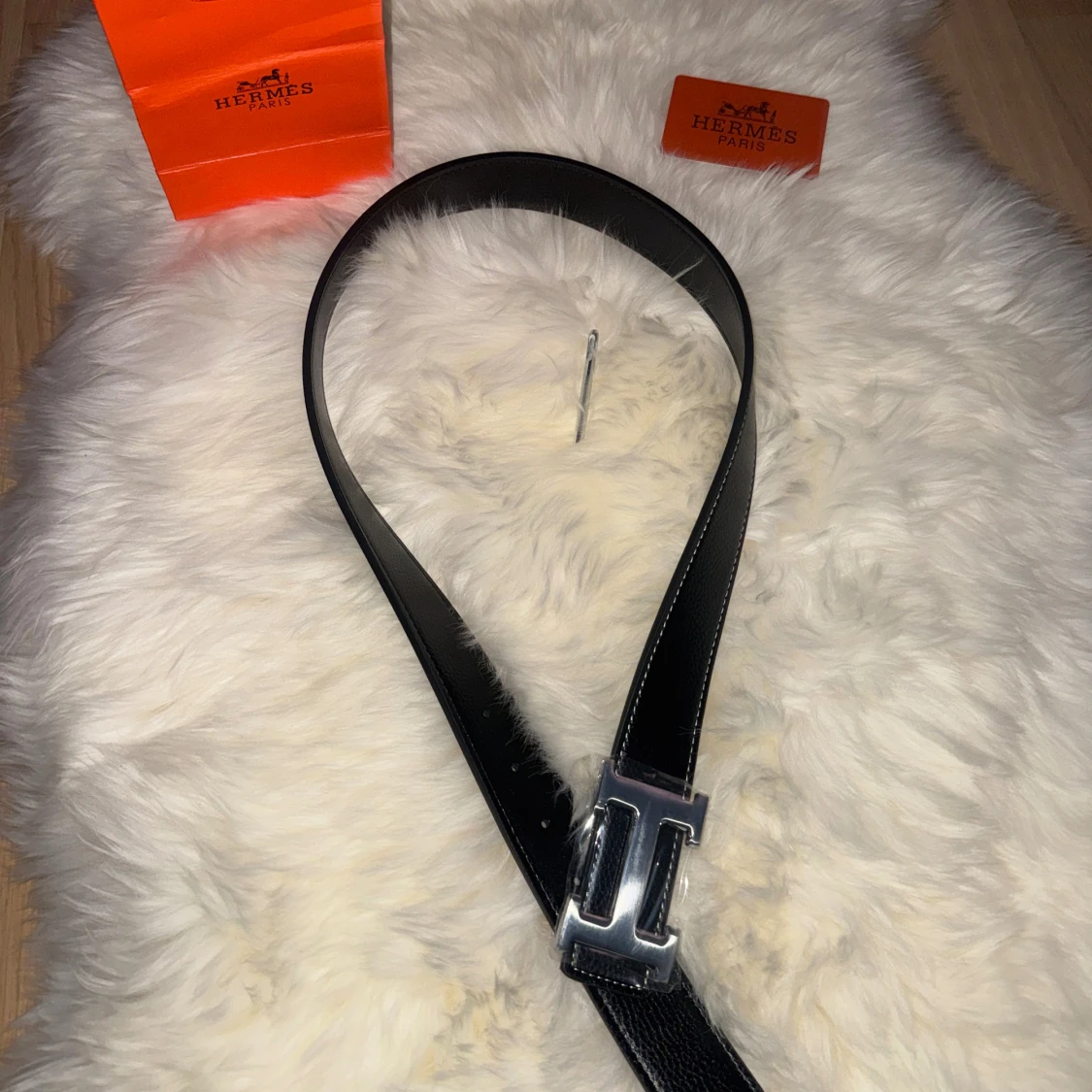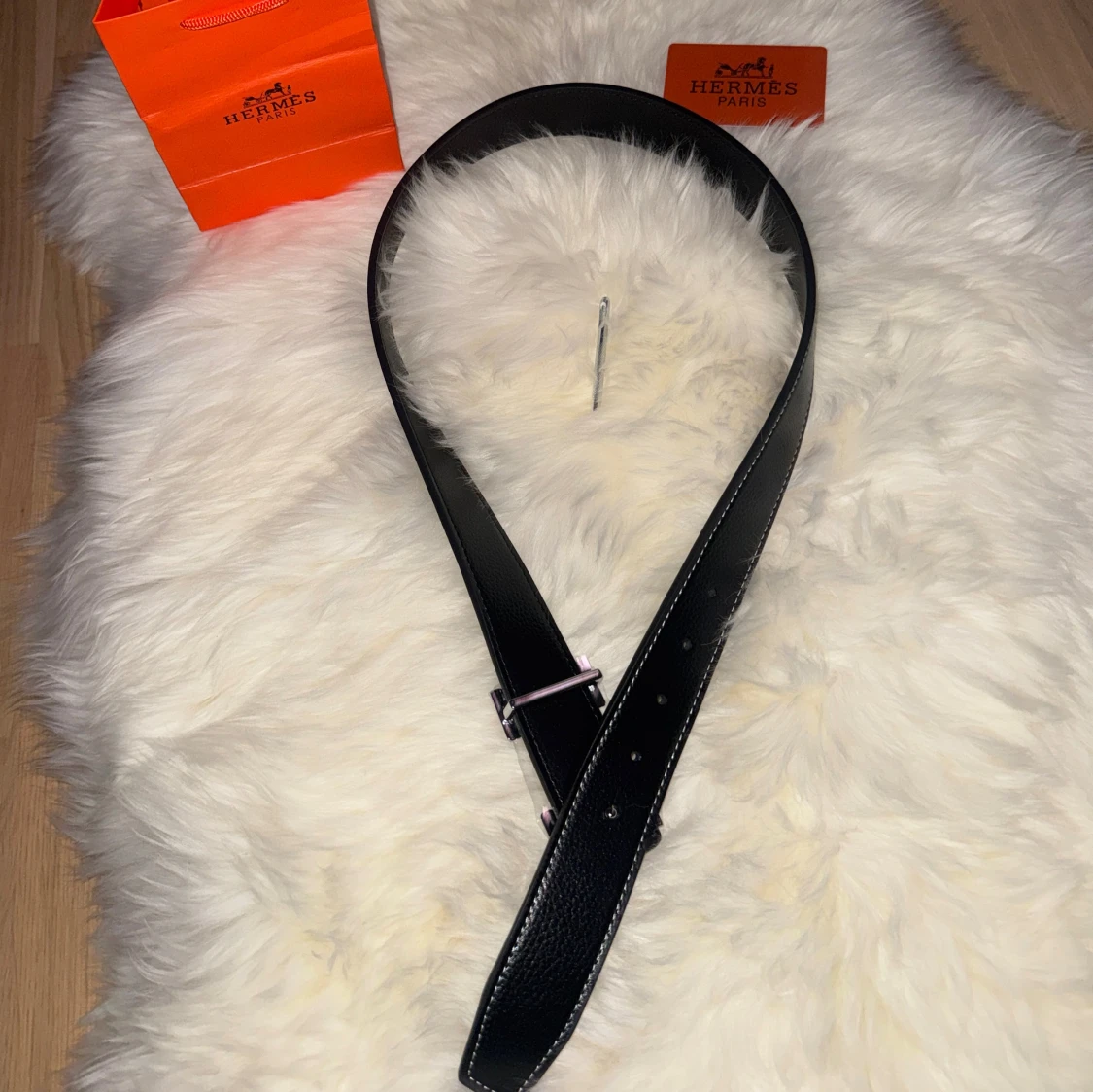 Säljer ett stilrent svart H bälte i skinn med klassiskt H-spänne i silverfärgad metall. Bältet har en slät, elegant form och vit kontrastsöm längs kanterna. Perfekt accessoar för att lyfta din outfit med lyxig känsla.box medkommer ej håltagare medkommer
