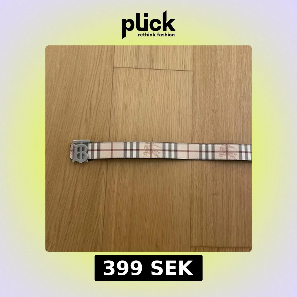 Säljer ett snyggt Burberry-bälte med klassiskt rutigt mönster i beige, brunt och rött. Bältet har en bred design och en stor silvrig spänne med Burberrys ikoniska TB-logo. Perfekt för att lyfta vilken outfit som helst.