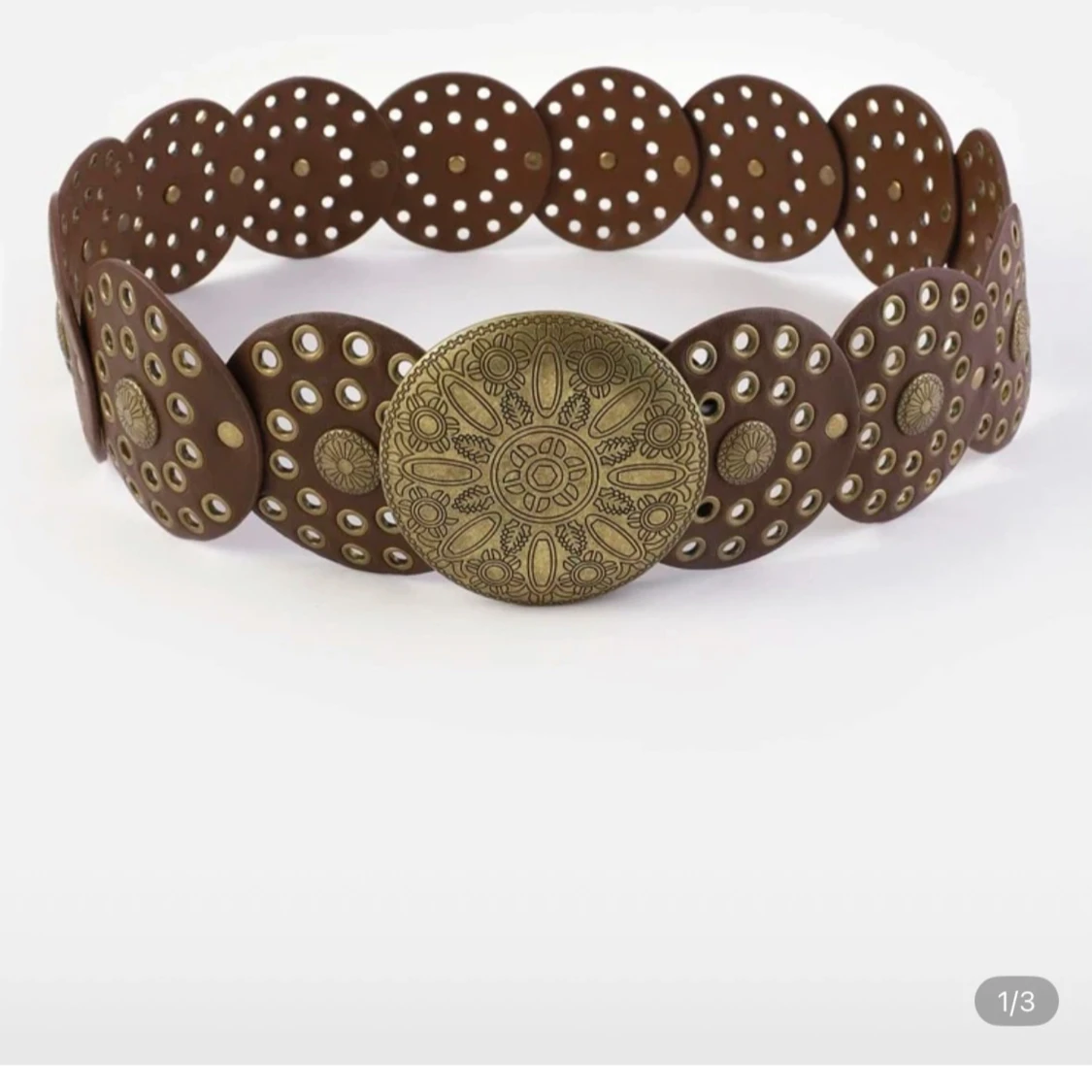 Unikt brunt bälte med stora runda plattor i skinn och metall, dekorerat med hålmönster och en stor guldfärgad medaljong framtill.