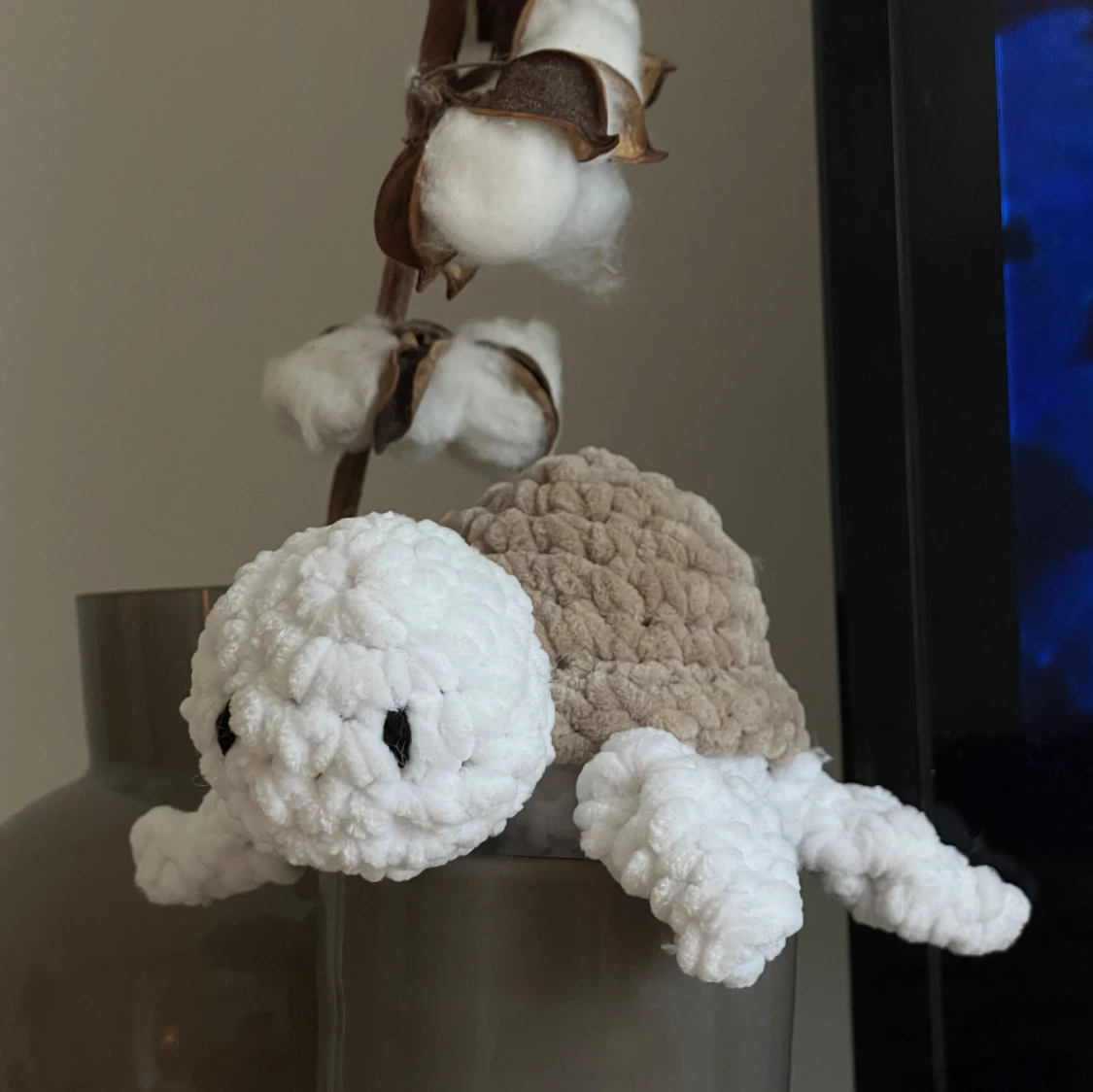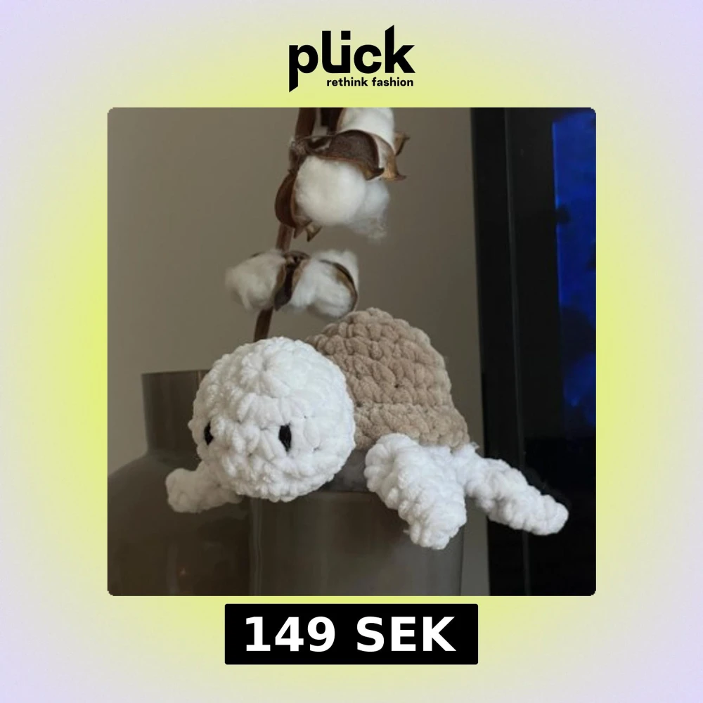 En virkad sköldpadda i mjukt garn, med vit kropp och beige skal. Lokalt inköpta garner och verktyg, helt handgjord av mig. Perfekt för dig som gillar söta gosedjur och unika dekorationer 🤎 Storlek: 16x14cm