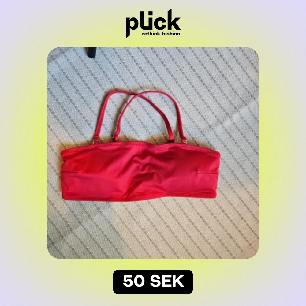 röd bikinitopp med axelband som crossar i ryggen. använd 1 gång. klippt bort lappen då den var extremt lång, men vet att det är storlek M