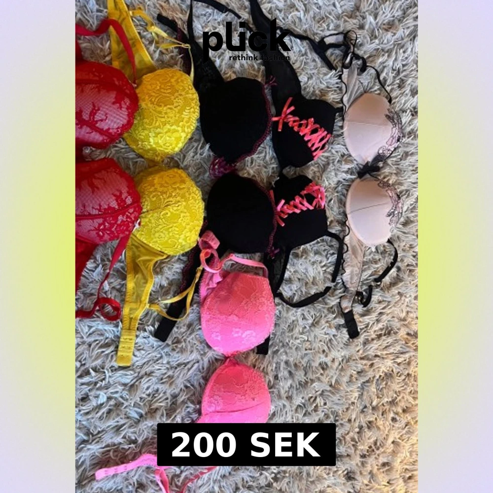 Säljer flera vintage bhar i olika färger: röd, gul, svart, rosa och beige. Vissa har spetsdetaljer, andra har snörning med rosa band framtill. Materialet är mestadels spets och syntet. Perfekt för dig som vill ha något extra under outfiten. Alla är vintage från 2000s. 50-75kr styck eller alla för 200. Storlekarna varierar från A-D