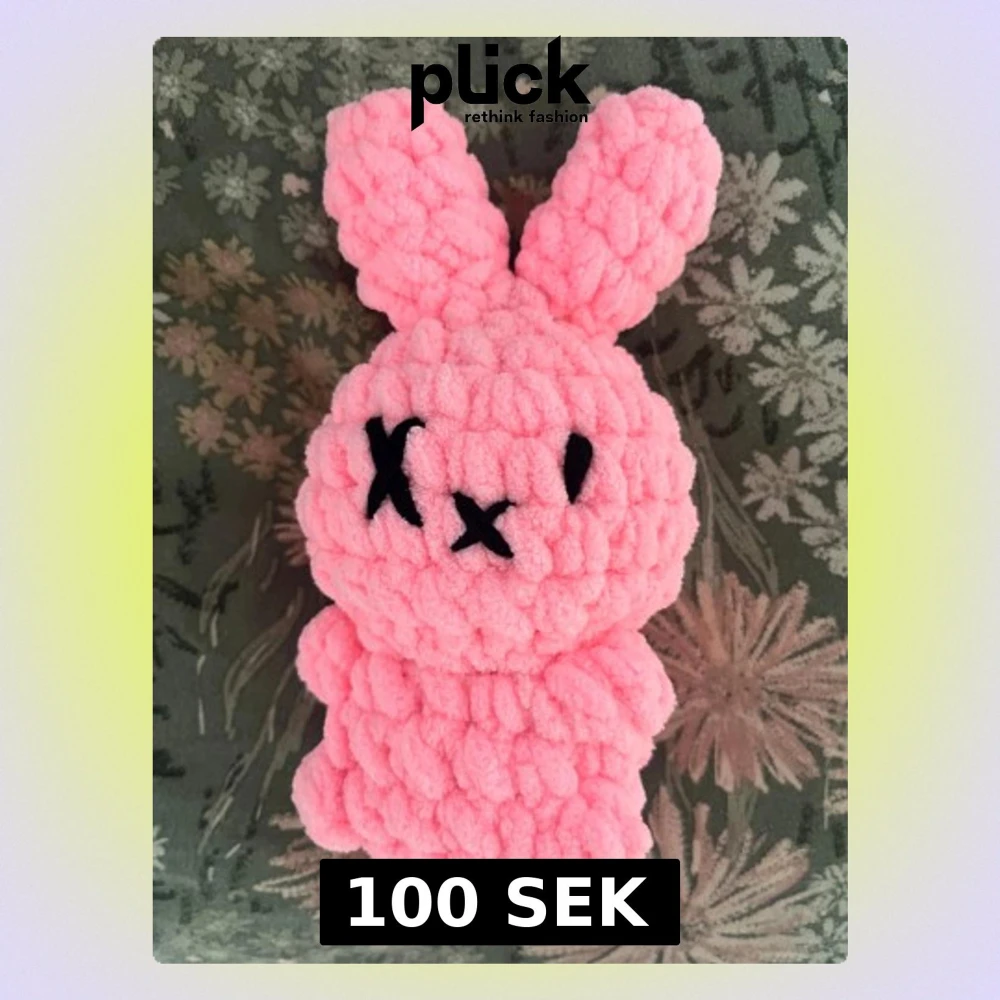 Supergosig och unik liten kanin i fluffigt, mjukt garn. Den är handgjord och har en charmigt quirky stil med korsade ögon i svart broderi. Perfekt som dekoration, present eller som ett gulligt samlarobjekt. För dig som älskar cute, handmade och lite quirky plushies! 💗