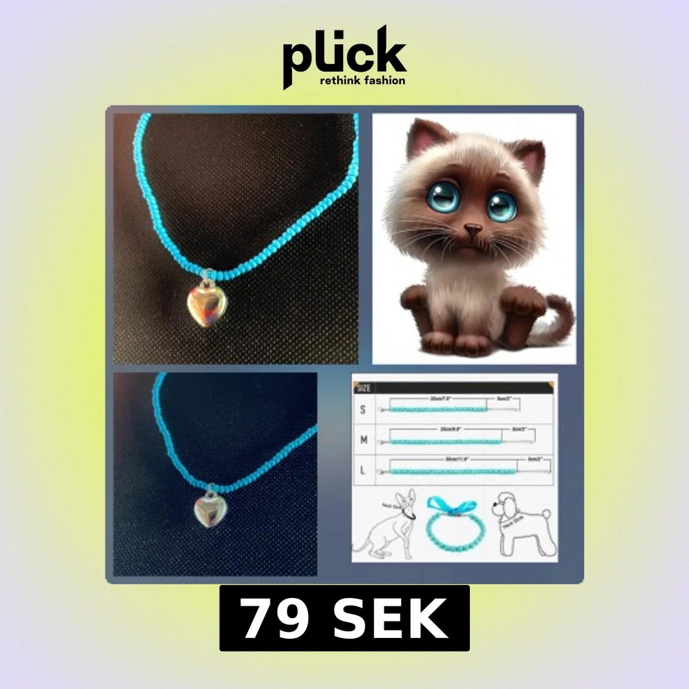 Ett sött halsband med små blå pärlor och ett silverfärgat hjärthänge. Perfekt accessoar för att ge kattens stil en färgklick och lite extra charm. Halsbandet har en enkel och trendig design som passar till många katter.