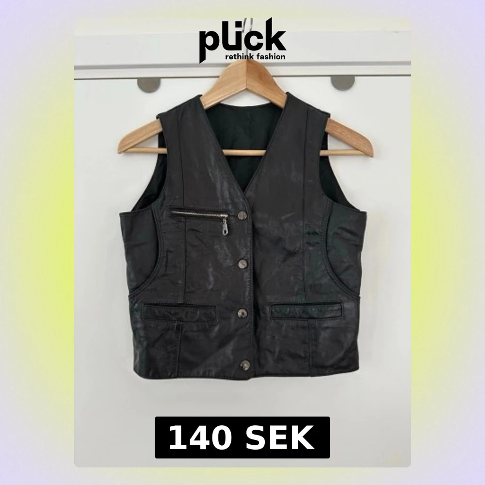 Cool svart väst i skinn med klassisk v-ringad design. Västen har tre framfickor, varav en med silverfärgad dragkedja, och knäpps med fyra metallknappar framtill. Passar perfekt till lager-på-lager och ger en edgy vibe till din outfit.