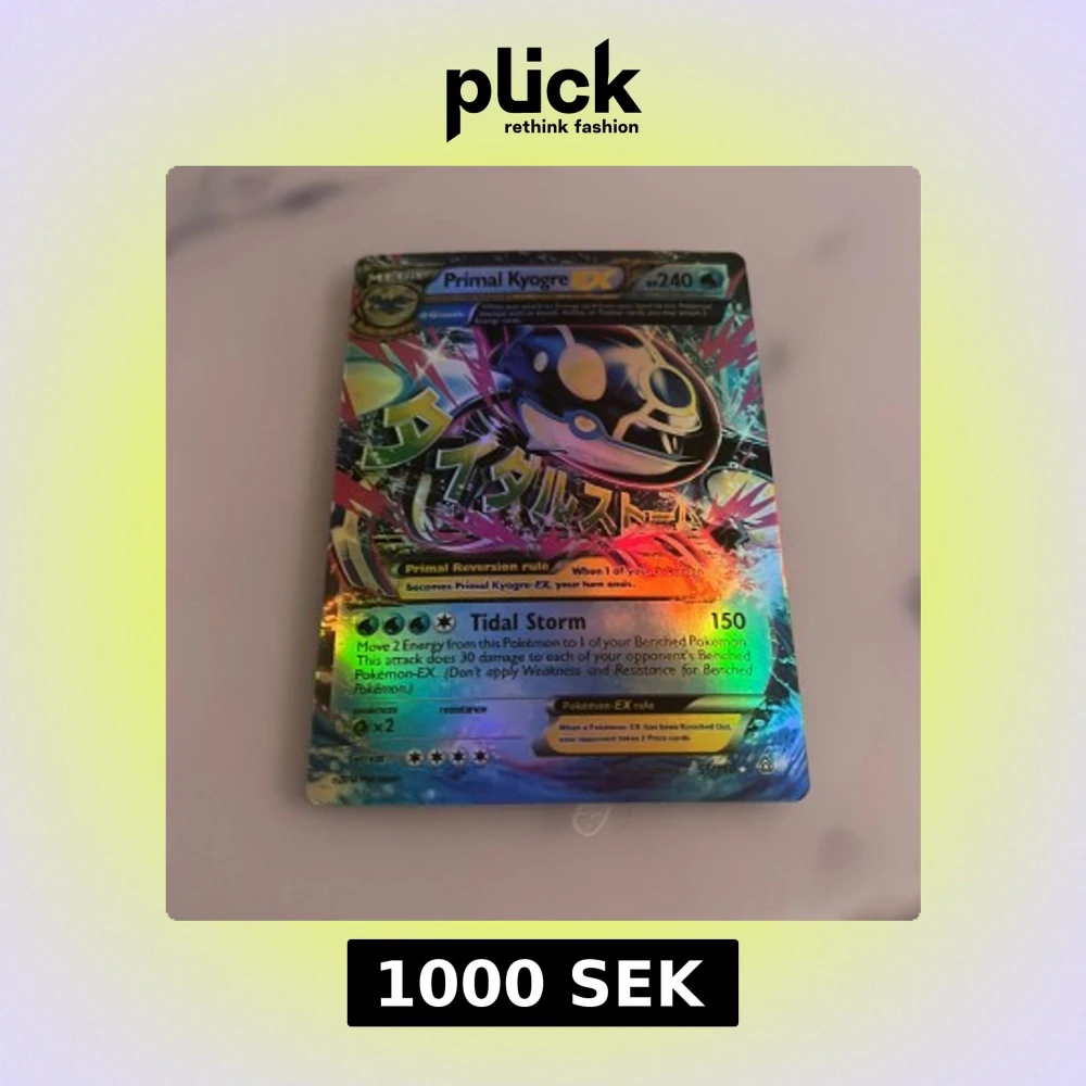 (Psa 9) Säljer ett holografiskt Primal Kyogre EX Pokémonkort med 240 HP och attacken Tidal Storm. Kortet har en färgglad design med japansk text och är en del av Pokémon EX-serien. Perfekt för samlare eller spelare som vill förstärka sin kortlek.