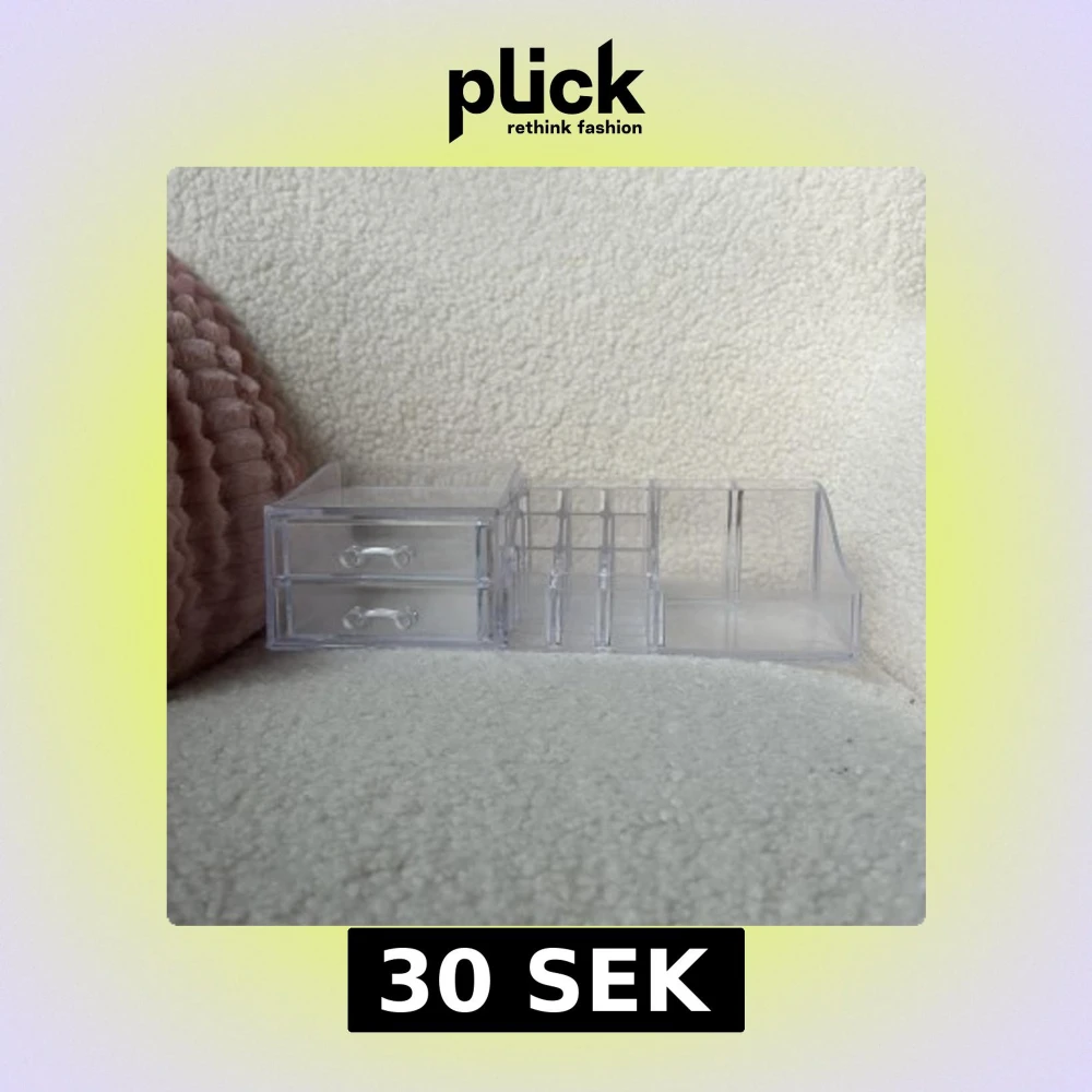 Praktisk och stilren transparent sminkförvaring med två lådor och flera fack för organisering av sminkprodukter. Perfekt för att hålla ordning på sminkborstar, läppstift och andra små tillbehör.