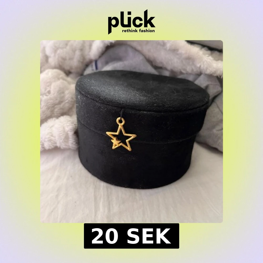 Superfin rund smyckesväska i svart sammet med en guldig stjärnberlock framtill. Insidan är ljusbeige med spegel i locket och flera fack för ringar och smycken. Perfekt att ha på resan eller hemma på hyllan.