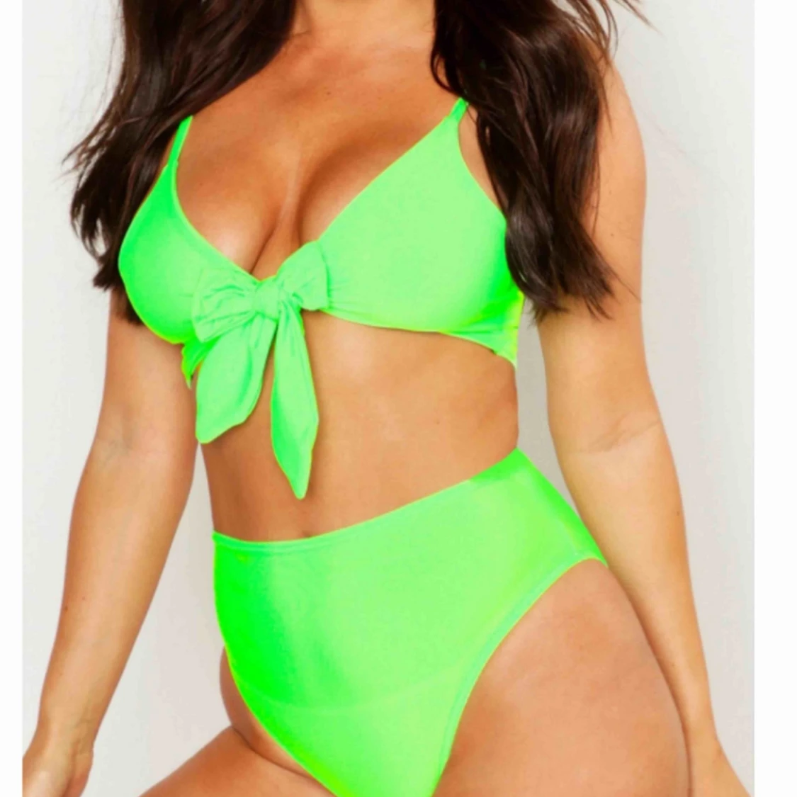En neongrön treangel bikini från boohoo i ny skick! Ändast testad med underkläder och lappen sitter kvar. Supertrendig och skitsnygg nu till sommaren! High waist bikini underdel och kytning på överdelen. Passar även toppen på en str 34 men det var tyvärr inte min stil. Köparen står för frakten (20 kr)!🌻