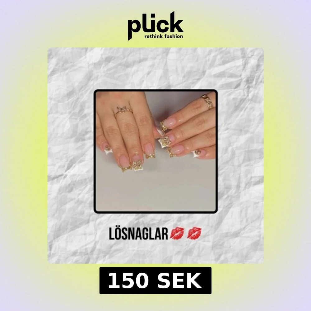 SĂ€ljer ett set lösnaglar med nude bas, vit fransk tipp och detaljer i guld, bling och smĂ„ symboler. Naglarna Ă€r fyrkantiga och kommer med prep kit: nagelfil, nagellim och cuticle pusher. Perfekt för dig som vill ha extra glam pĂ„ hĂ€nderna. Vid intresse Ă€r du vĂ€lkommen att kontakta mig för dina framtida favorit naglar!â€ïž
