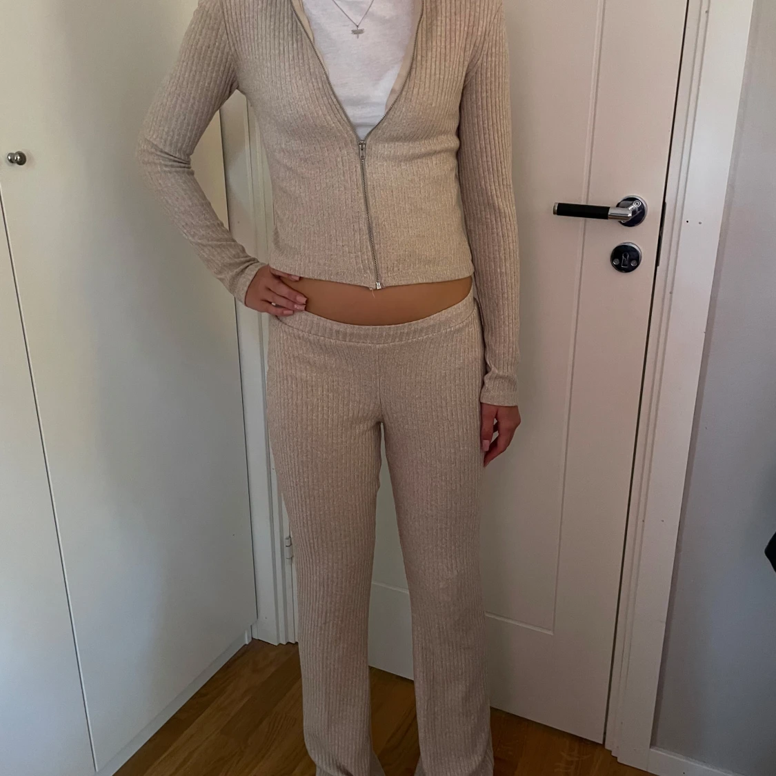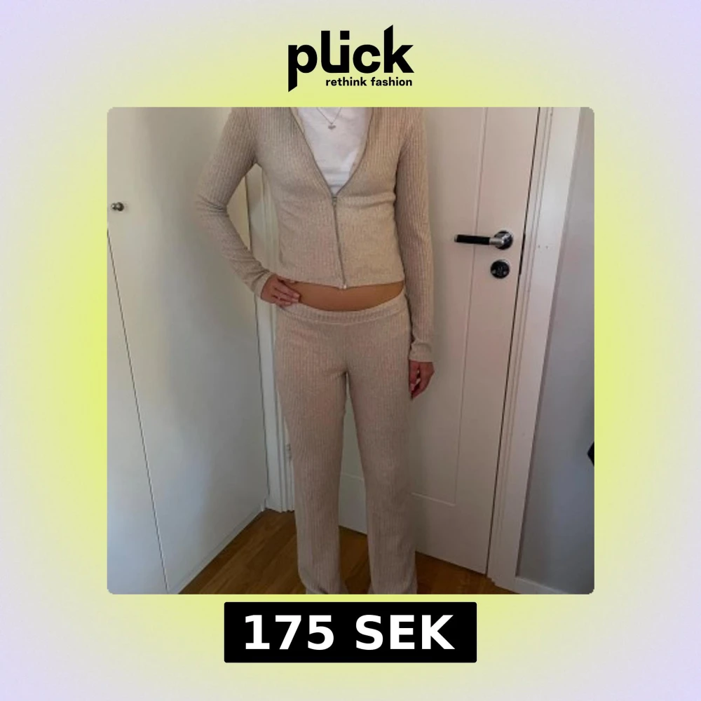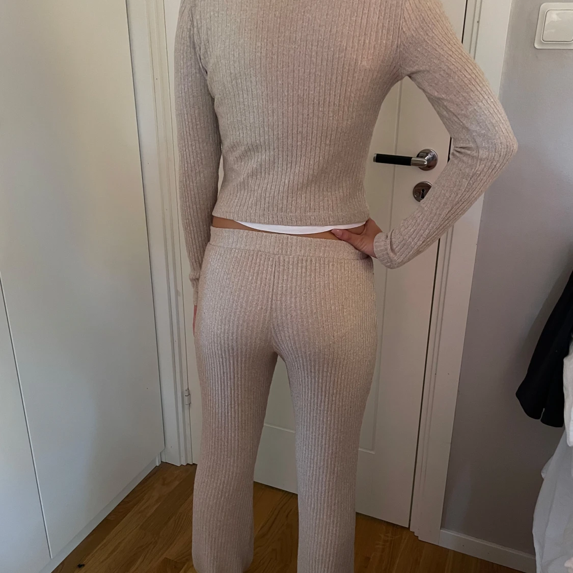 Ett ljust set med både tröja och byxor! (Färgen på första 2 bilderna stämmer in bättre, då ljuset på andra 2 bilderna var dåligt). Mycket bra skick! Det går att köpa tröja och byxorna separat! 💗