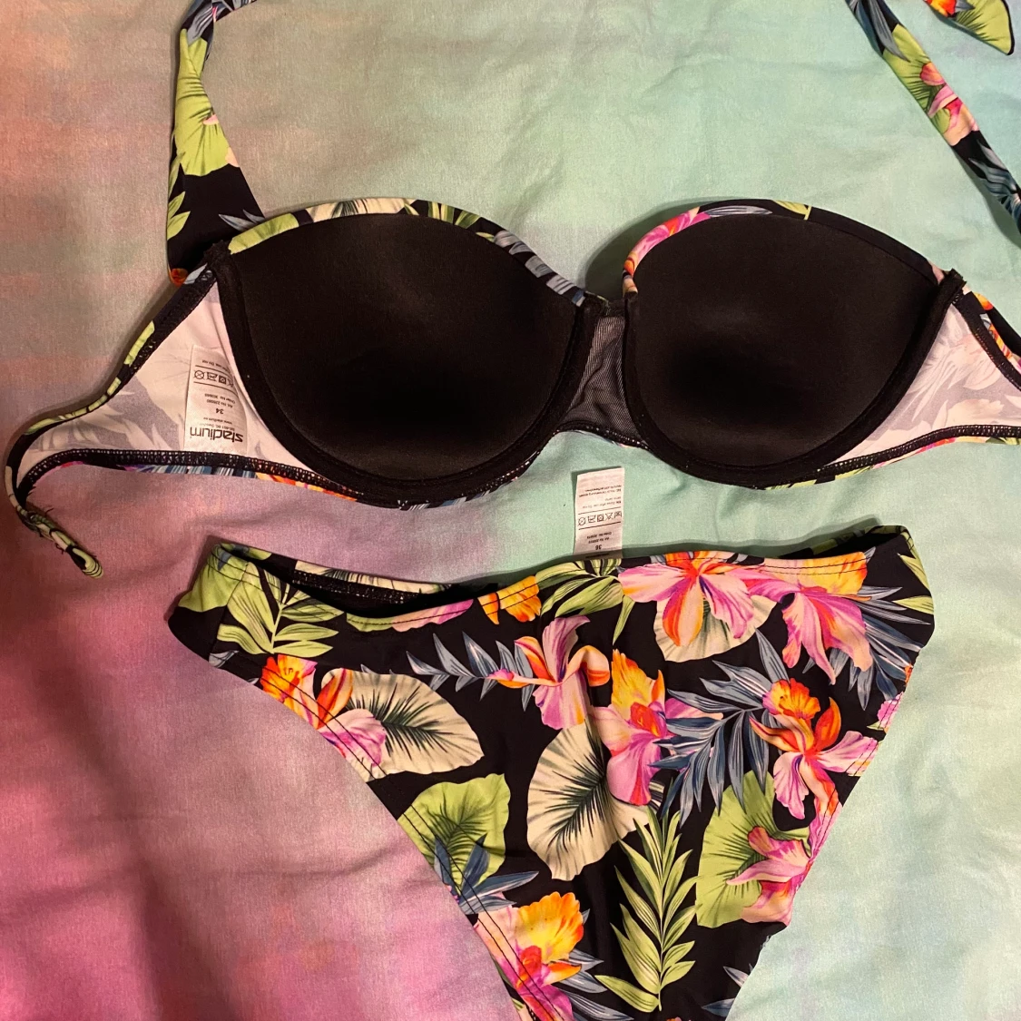 Bikiniset, kan köpas tillsammans eller seperat. Toppen kan knytas både runt om halsen eller endast runt ryggen. Överdelen strl: xs/34 underdelen strl: S/36. Köparen står för frakt ☺️ båda kostar 80kr sammanlagt, 40kr var!