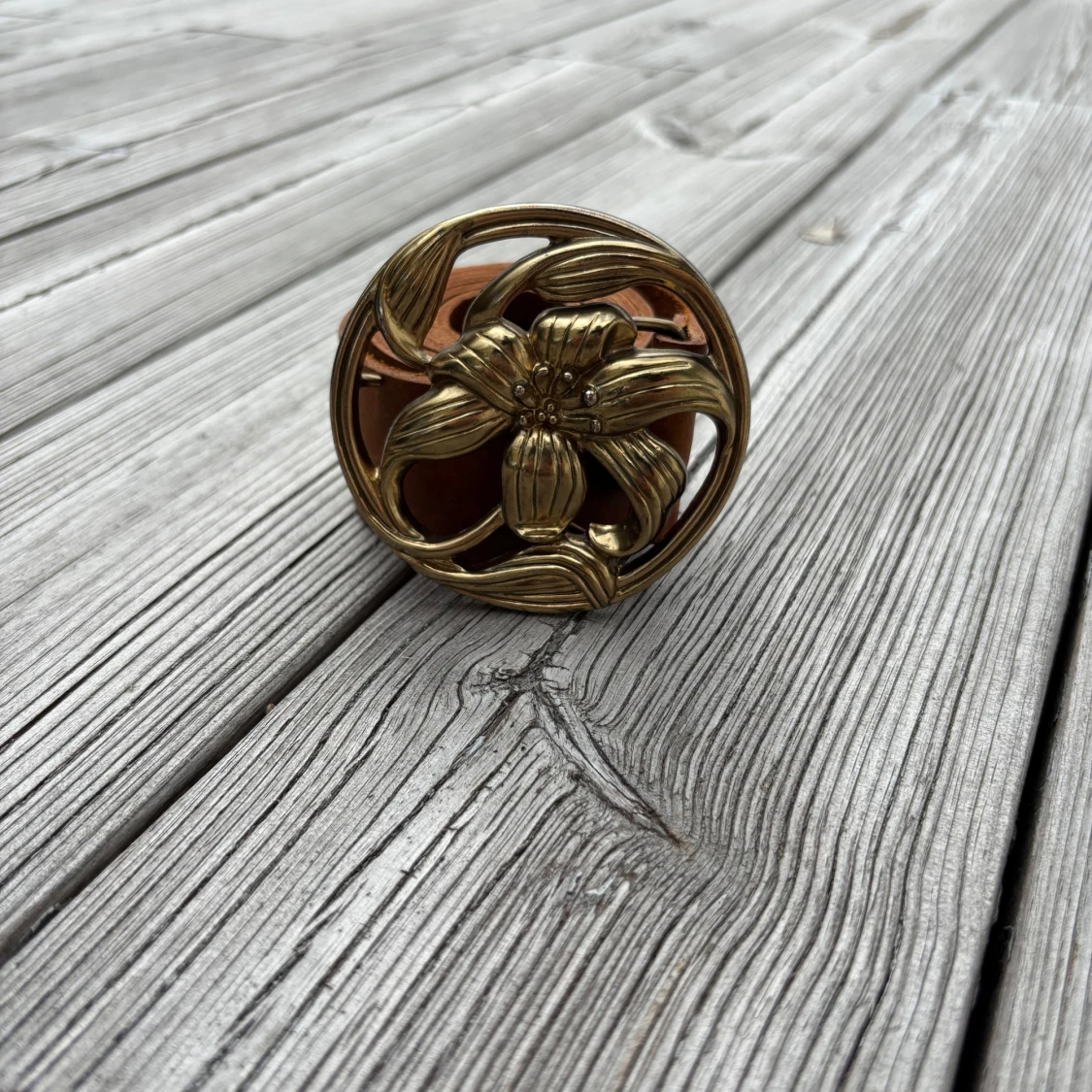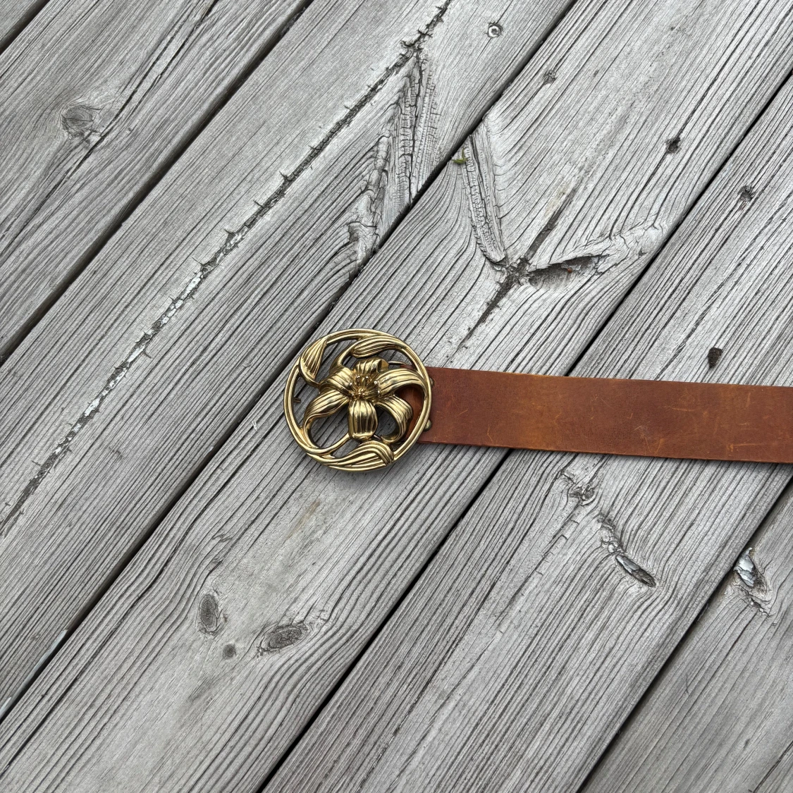 Brunt bälte med stor guldfärgad blomspänne
