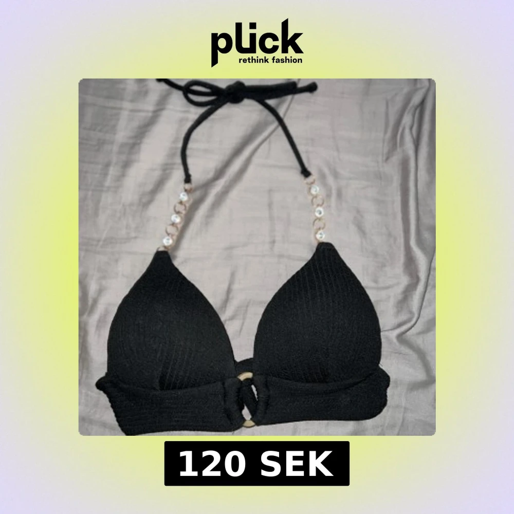 Supersnygg svart bikiniöverdel med ribbat material och knyt i nacken. Axelbanden har pärlliknande detaljer och en guldfärgad ring framtill. Bikinin har vadderade kupor och omlottband under bysten. Storlek S