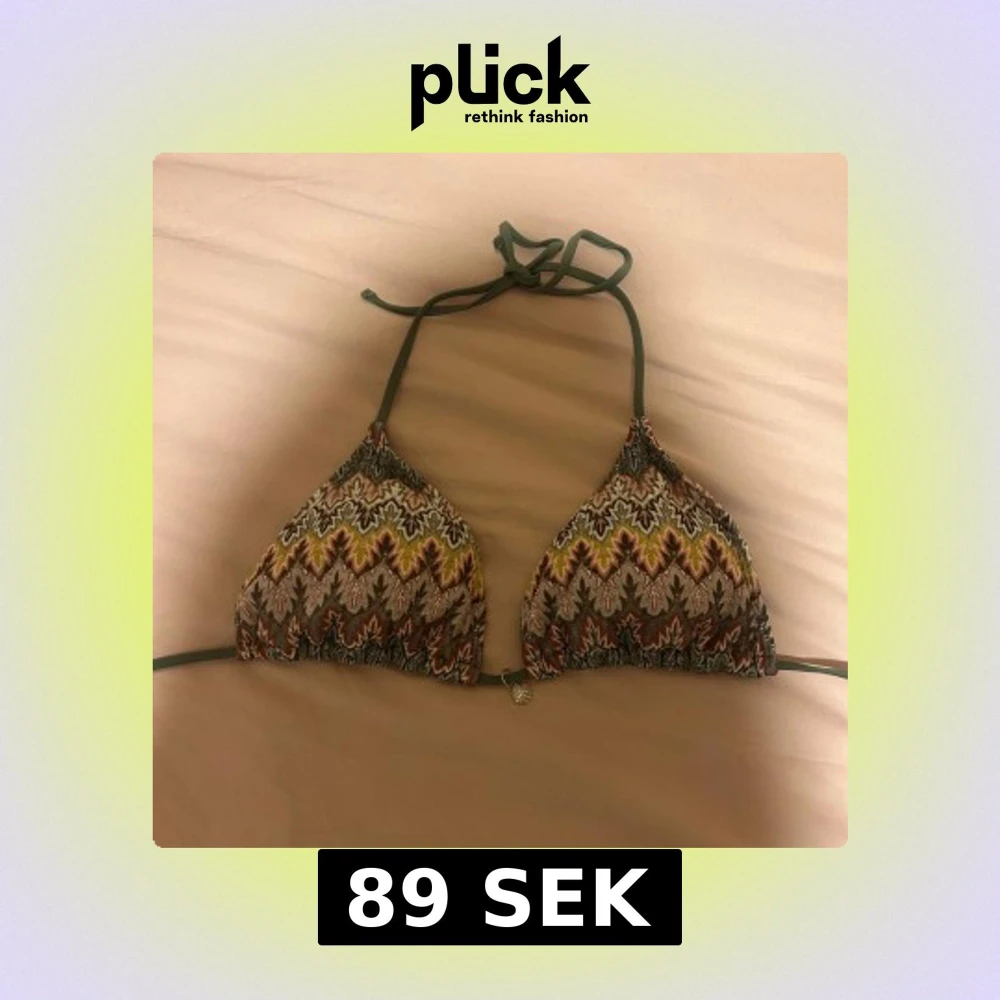 Snygg trekantsbikini med färgglatt mönster i grönt, gult, brunt och rosa. Bikinin har knyt i nacken och ryggen samt en liten metallberlock framtill. Det är storlek L men är liten i storlek, skulle säga att det är en S/M