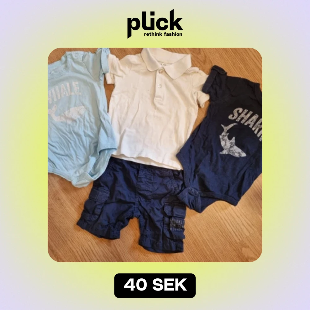Vit pikétröja från Hm strl. 68, 2 st. kortärmade bodys i storlek 6-12 mån (ca strl. 68-74) från Joe fresh, marinblå shorts strl. 68 från Kappahl. Allt är i fint skick.