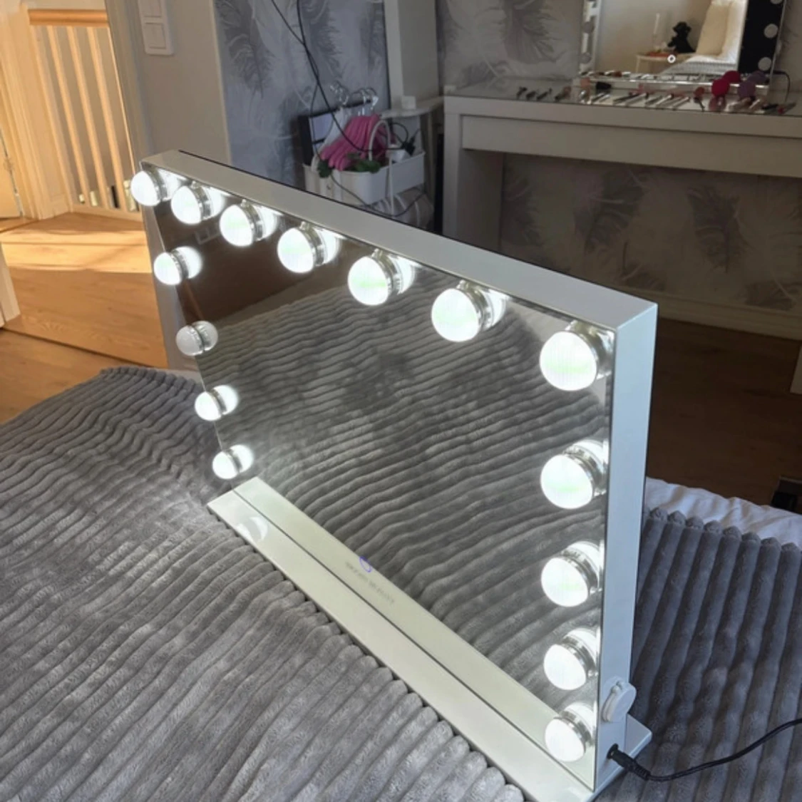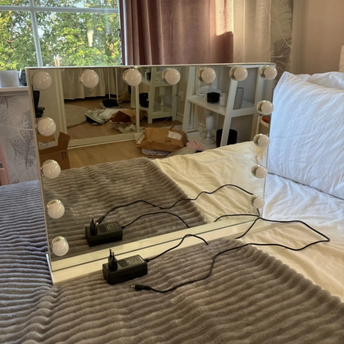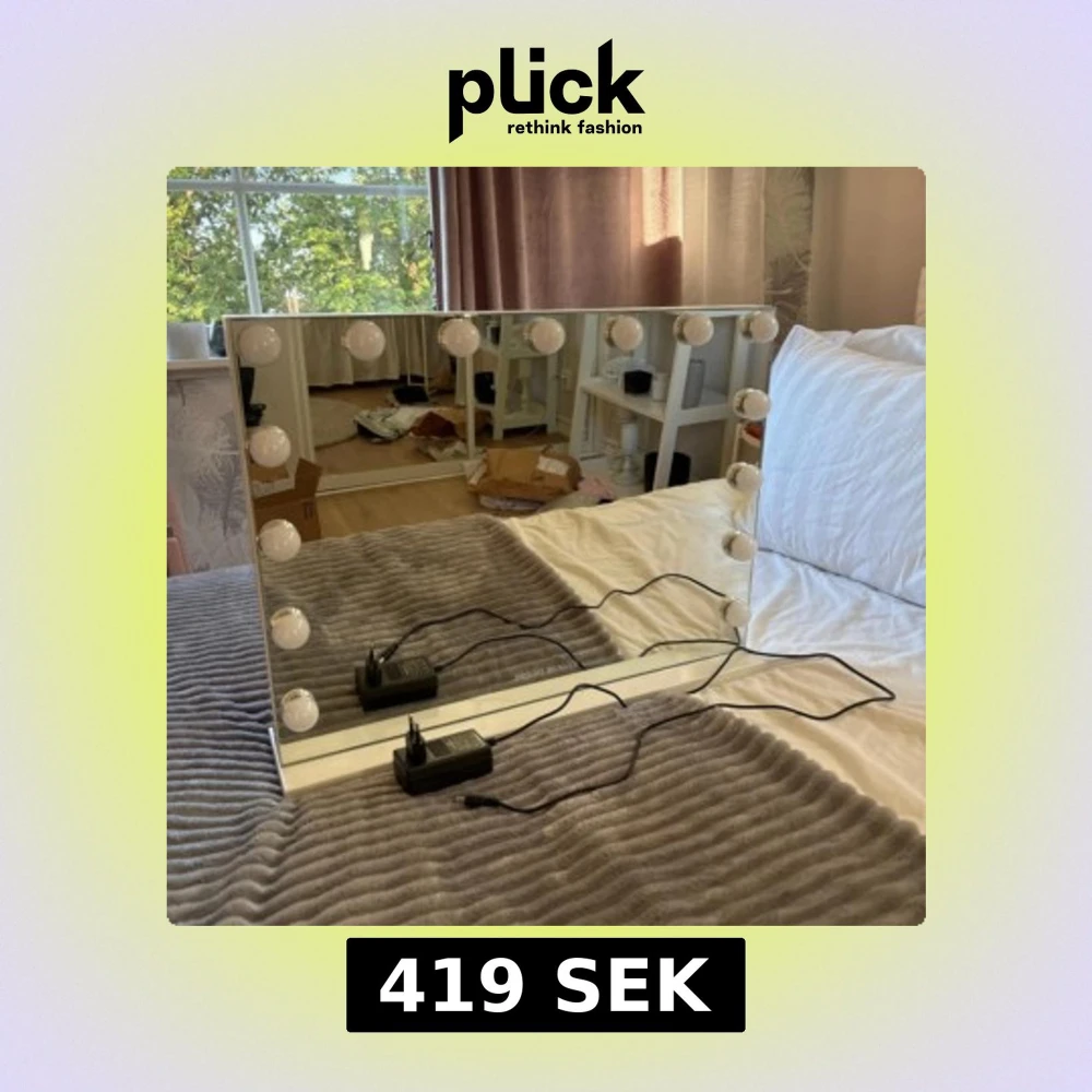 Säljer en jätte fin spegel från bright beauty som är alldeles ny! Ända är att en av lamporna inte fungerar som ni ser på dom 2 sista bilderna. Men annars jätte fin, bra och populär spegel! Den har en platta under så man kan ställa den men man kan även skruva bort plattan och hänga upp spegeln på väggen. På sidan sitter sladden och man kan även ladda sin mobil där. Den har 3 olika ljus. Kallt, varmt och dags ljus! Den kostar 900kr orgenalpris. Den är 58 cm lång och 46 cm hög. Hör av er vid frågor