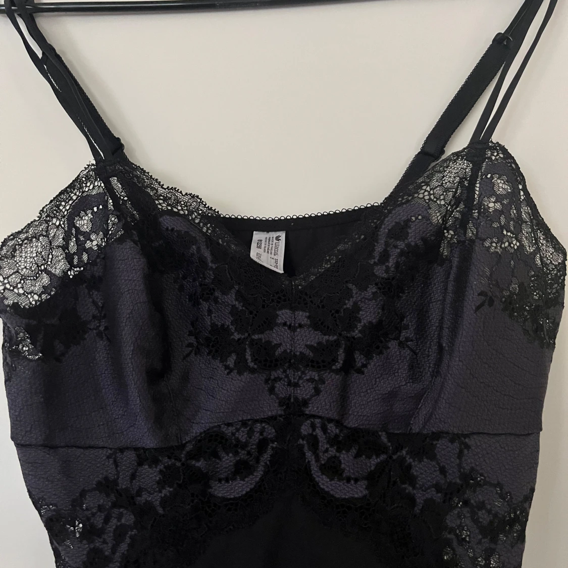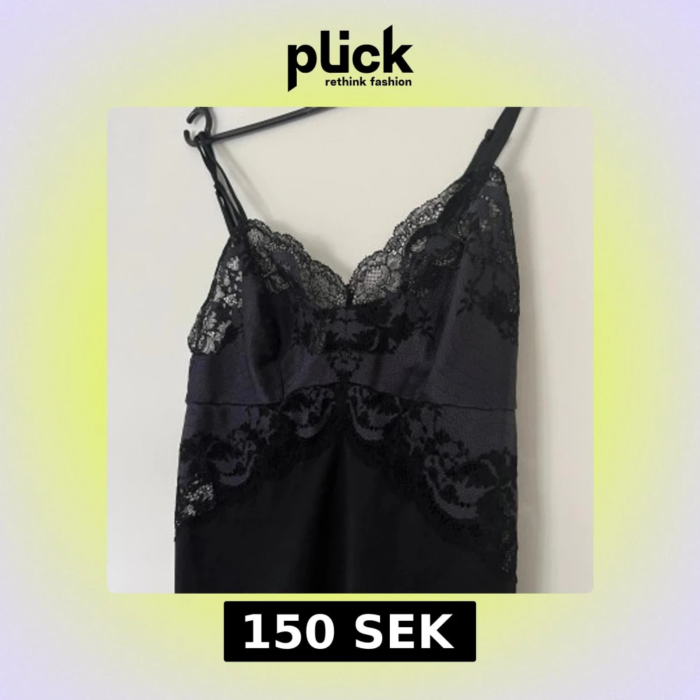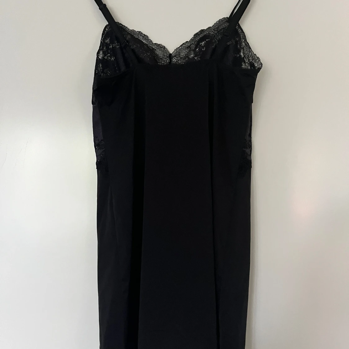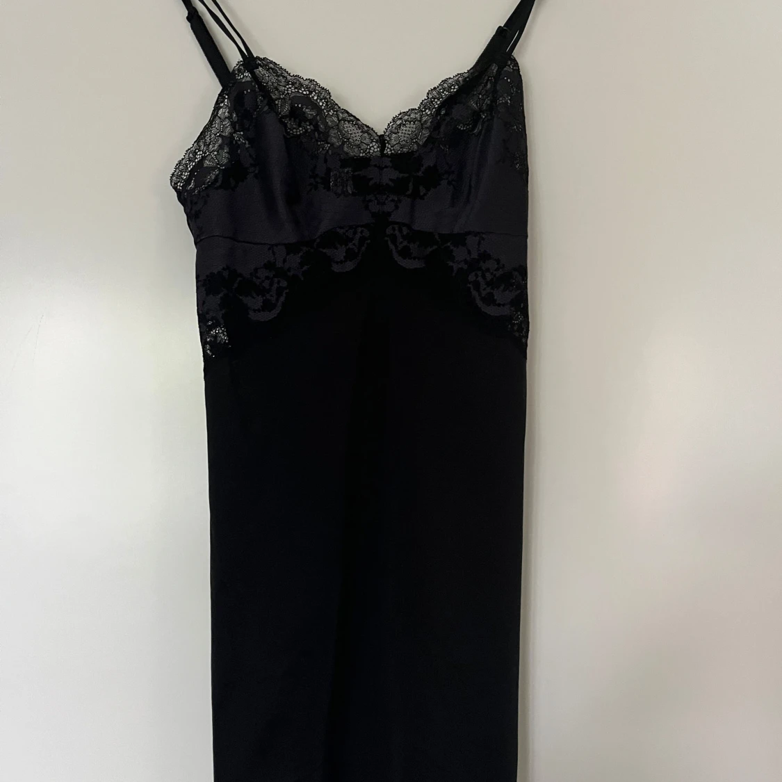 Svart satin nattlinne med spetsdetaljer från Wacoal. Storlek M. Klänningen har smala axelband, justerbara. Mycket fin passform och bra kvalite. Nyskick. 65% nylon och 35% spandex/elastan. Spet i 48% polyester (satin), 9% spandex och 43% nylon. Mått: Längd utan band ca 65 cm Byst ca 38 cm Midja ca 38 cm