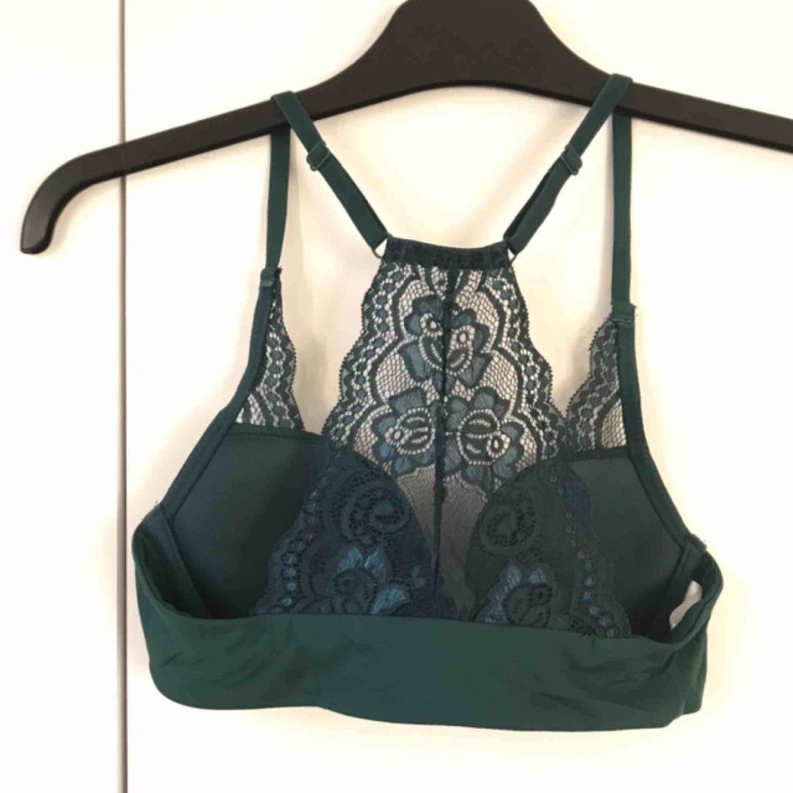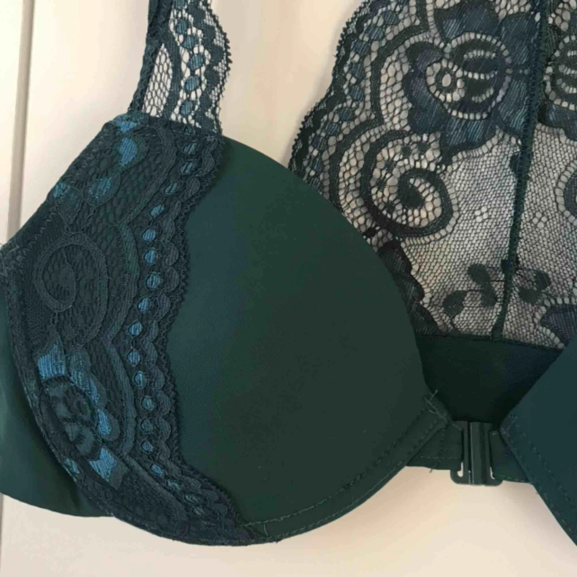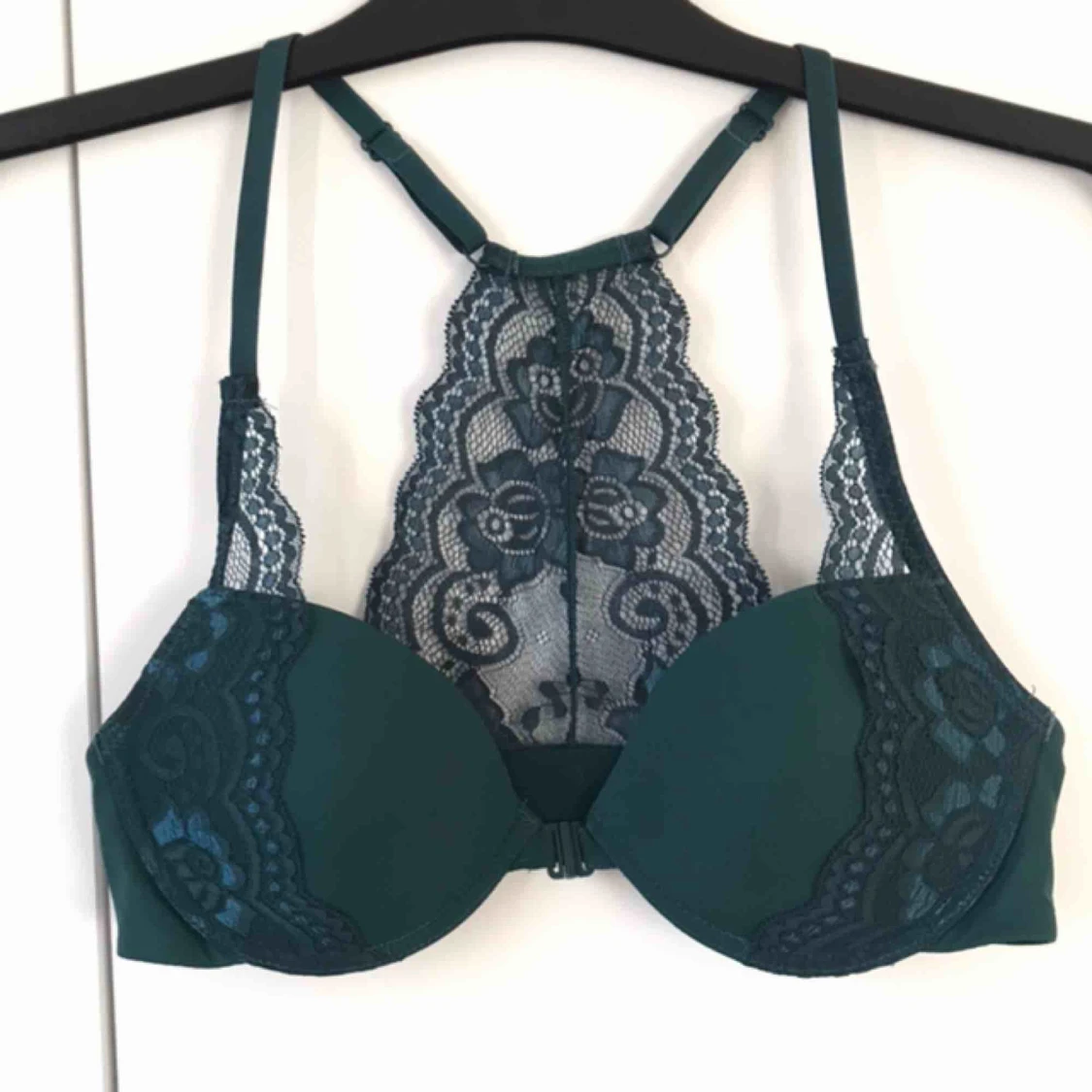 Jätte fin mörk grön BH med spets och detaljer, man knäpper den fram och finns ingen push up i den. Aldrig använd.