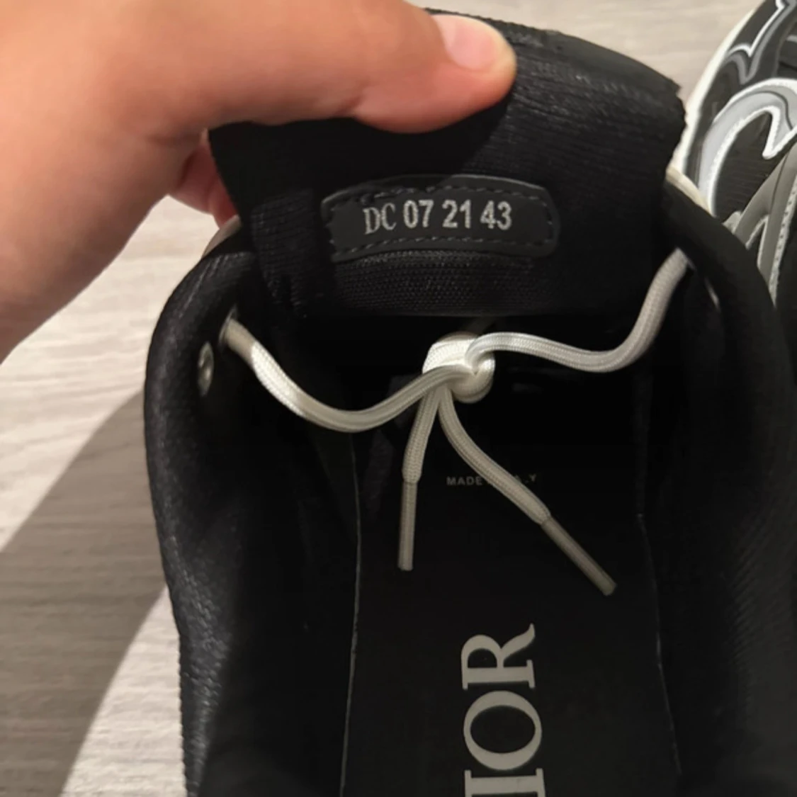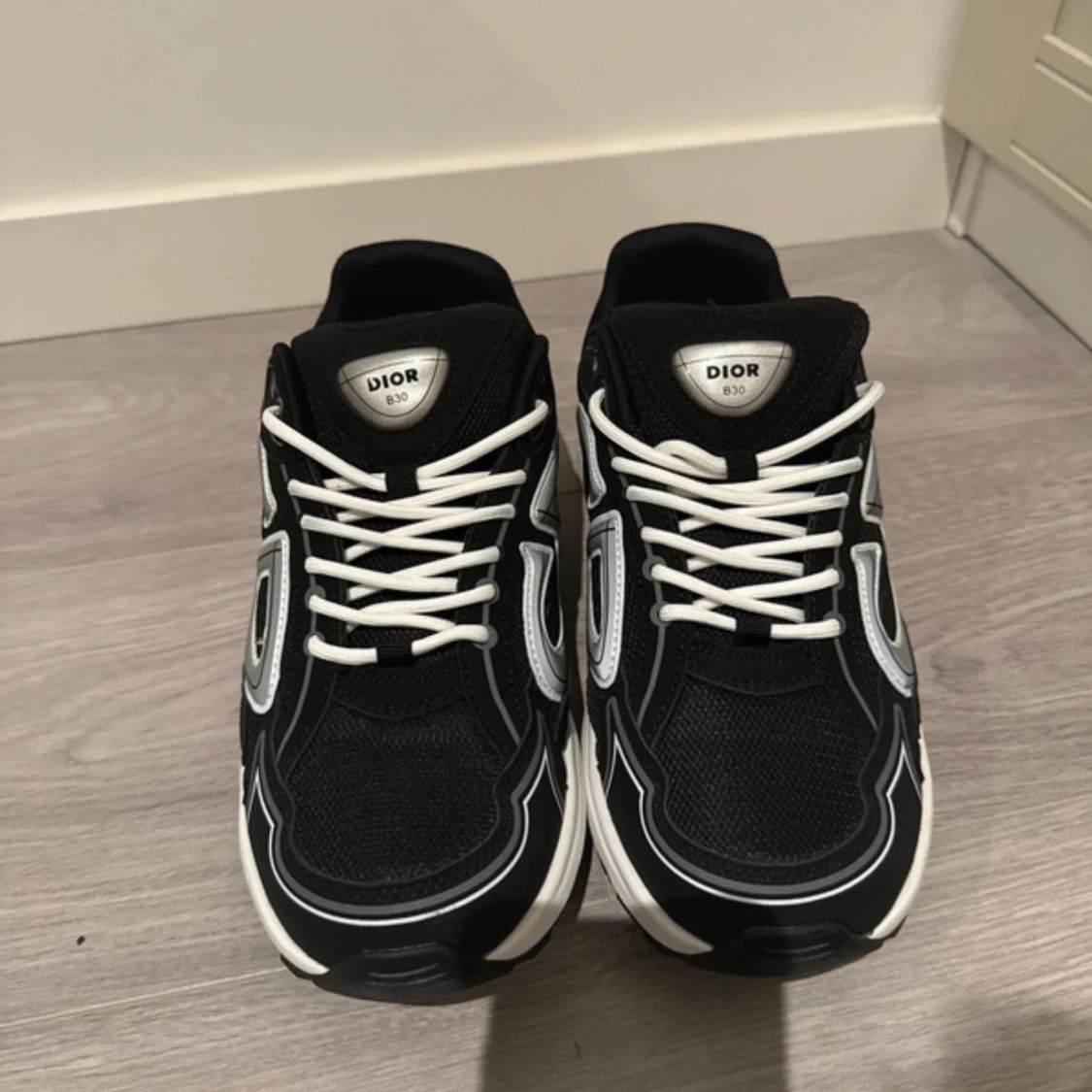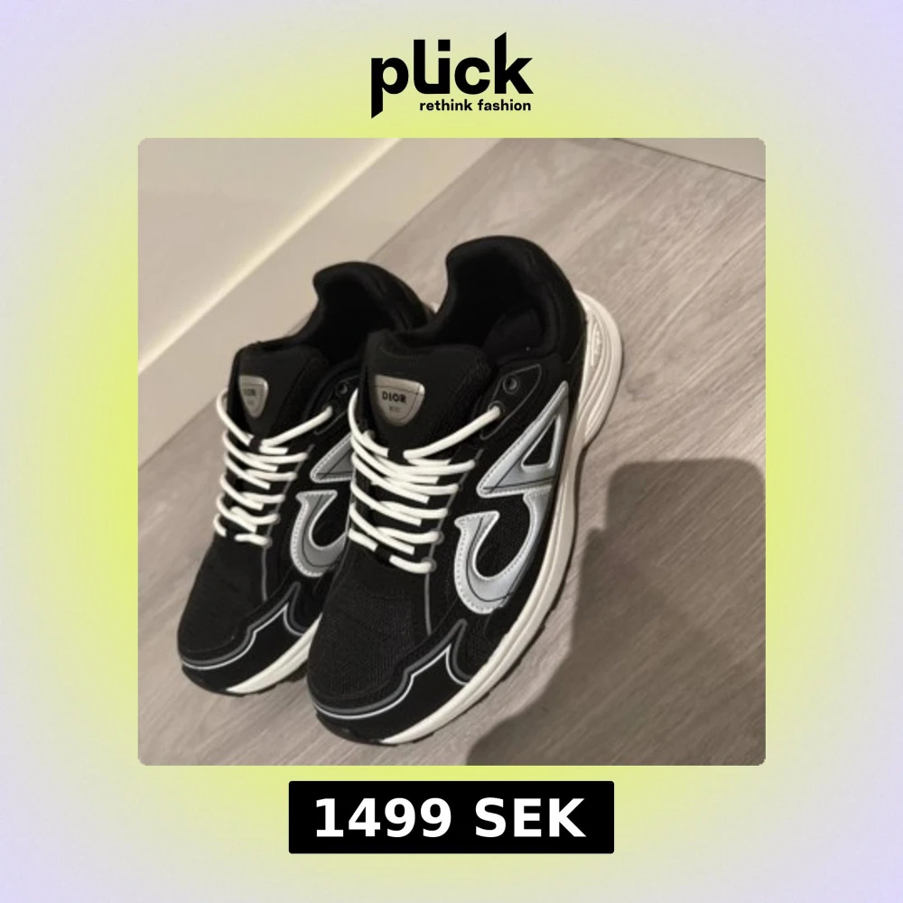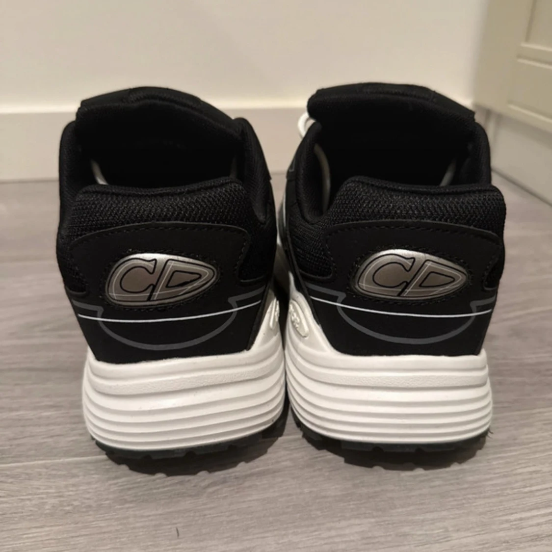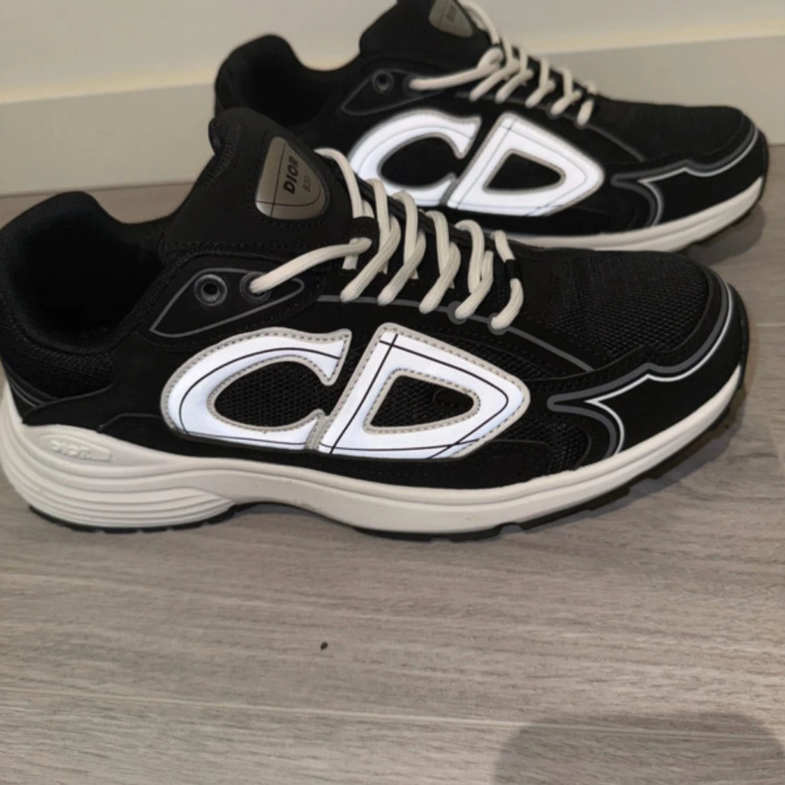 Säljer ett par svarta sneakers med silvriga detaljer och vit sula. Skorna har vit snörning, mesh och syntetmaterial samt coola CD-loggor bak. Perfekta för dig som vill ha en lyxig och trendig sneaker med sportig vibe.