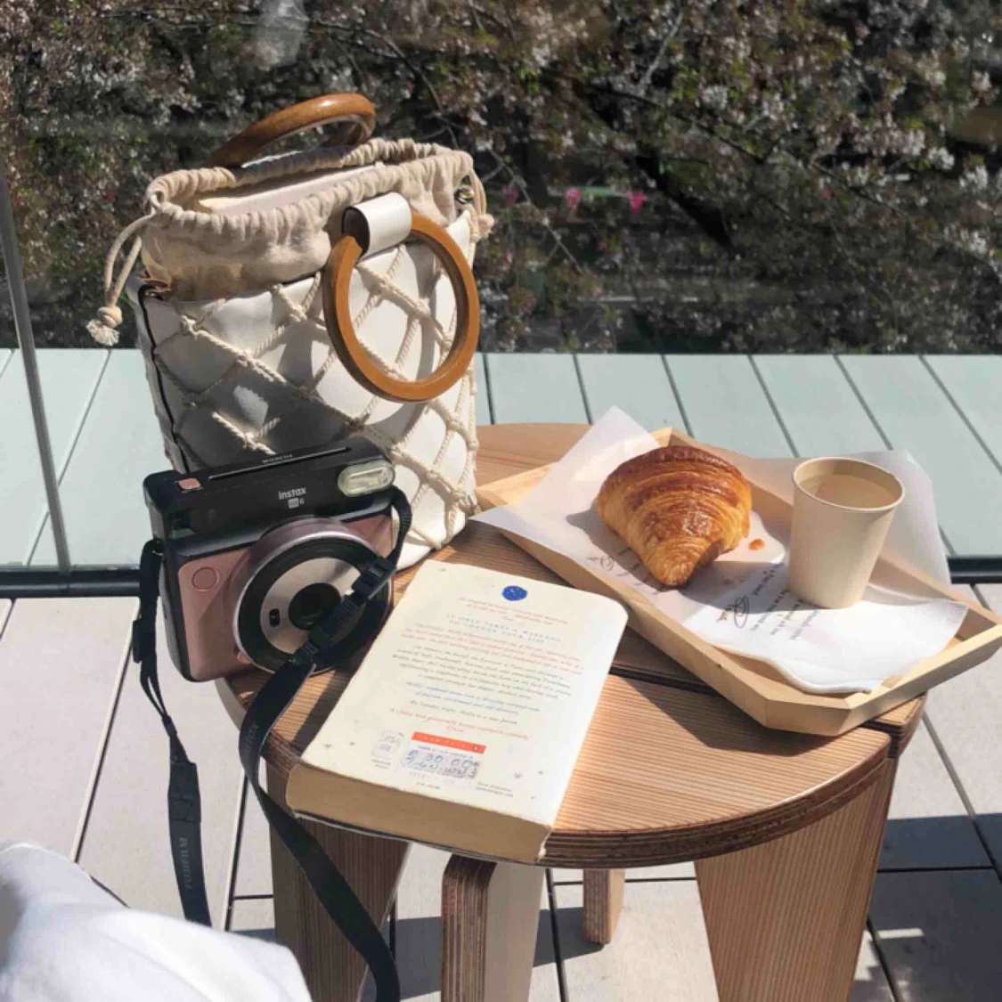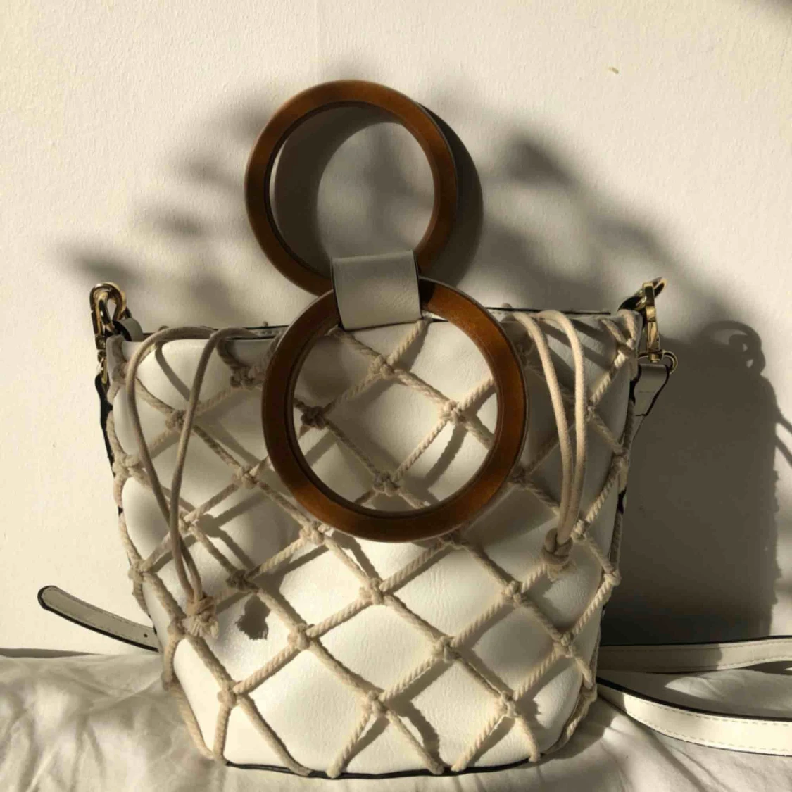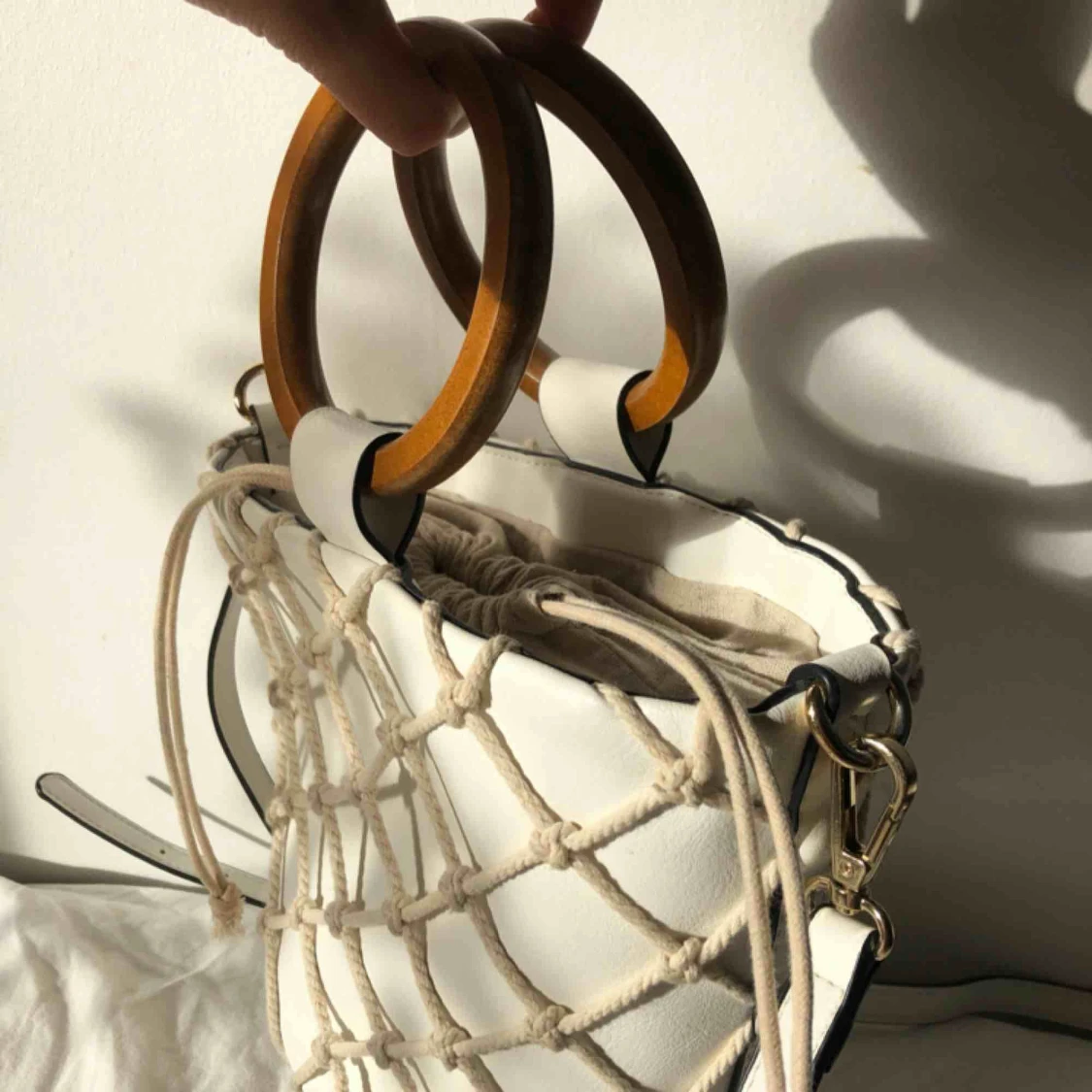 Somrig väska köpt på Sportsgirl i Australien. Väska och ”påse” inuti med handtag i trä, i fint skick. Medkommer med axelband. Perfekt nu till våren och sommaren🌞