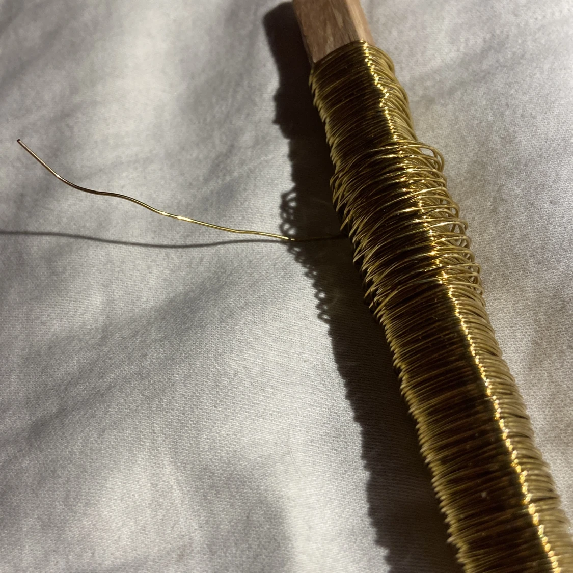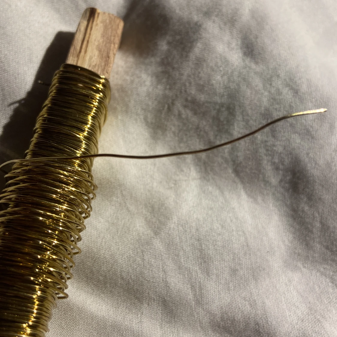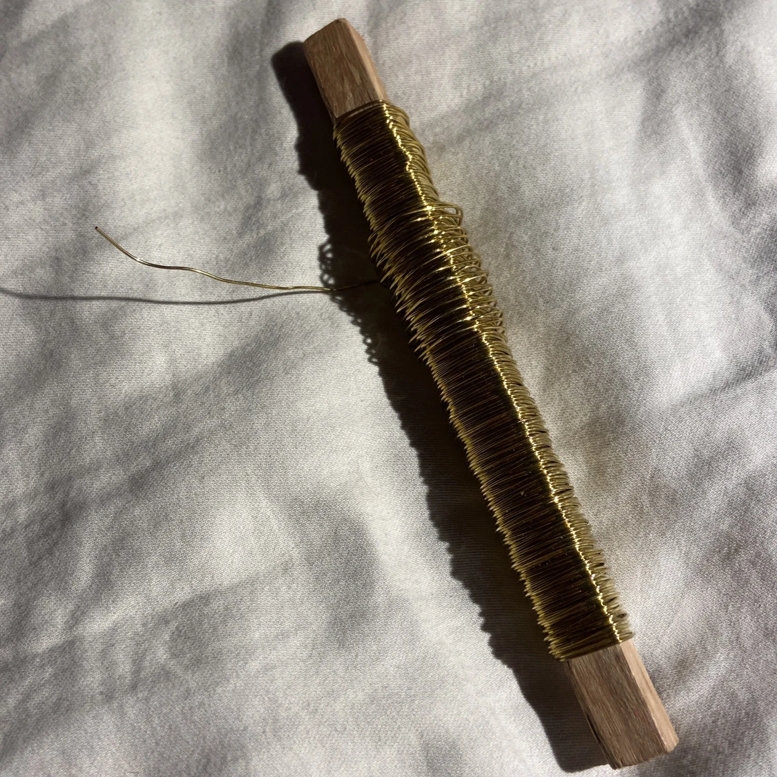 Guldig ståltråd. Vet inte hur lång, men många meter. Vet inte heller hur mycket av den som är använd, men inte så mycket. Perfekt att göra te.x. smycken med. Skickar med postnords frakt 15kr.