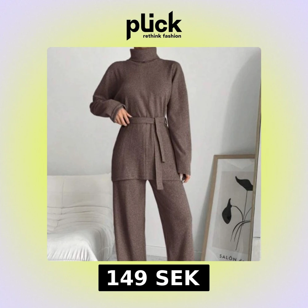 2 SETT. Bruna mysiga stickade byxor med loose passform och vida ben & tröja med turtleneck. Byxorna är ribbade och har en mjuk känsla, perfekta för en chill och stilren look.