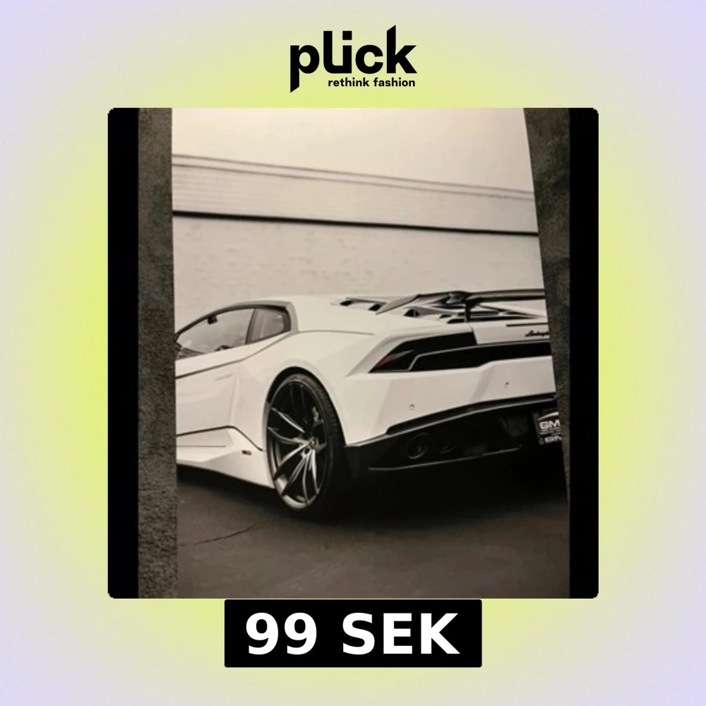 Poster med en vit sportbil, Lamborghini Huracán, fotograferad bakifrån. Bilen har sportiga fälgar, vinge och dubbla avgasrör. Skicket är mycket gott utan synliga defekter eller slitage. Perfekt för bilentusiasten som söker en exklusiv sportbil som poster.