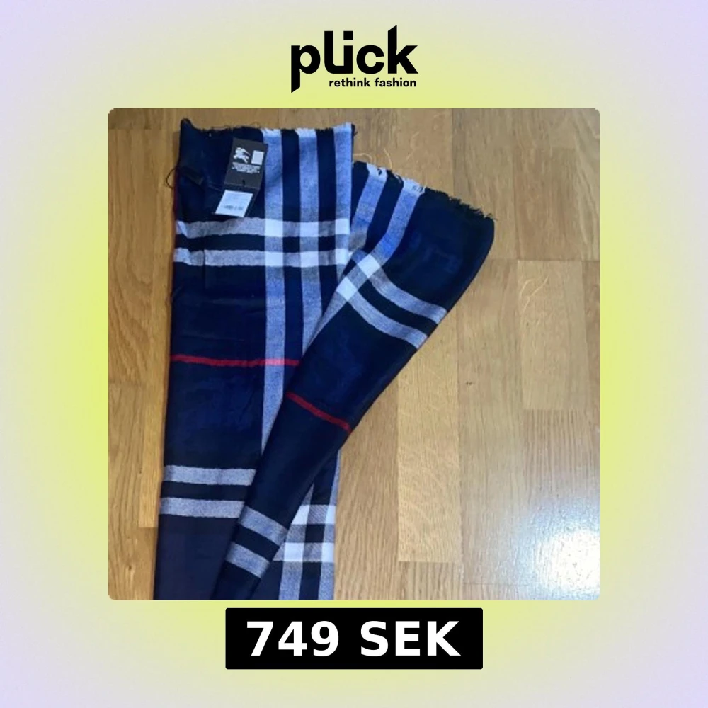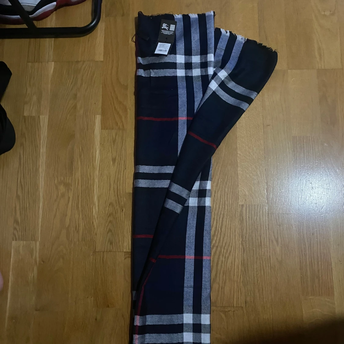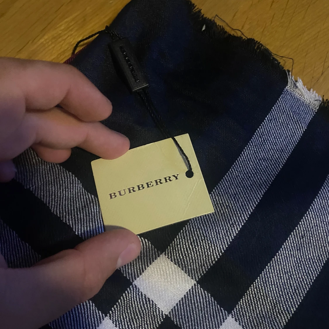 Snygg halsduk från Burberry i klassiskt rutigt mönster. Färgerna är marinblå, vit, svart och en tunn röd linje som ger extra edge. Halsduken är tunn och mjuk, perfekt att slänga över axlarna för en stilren look.