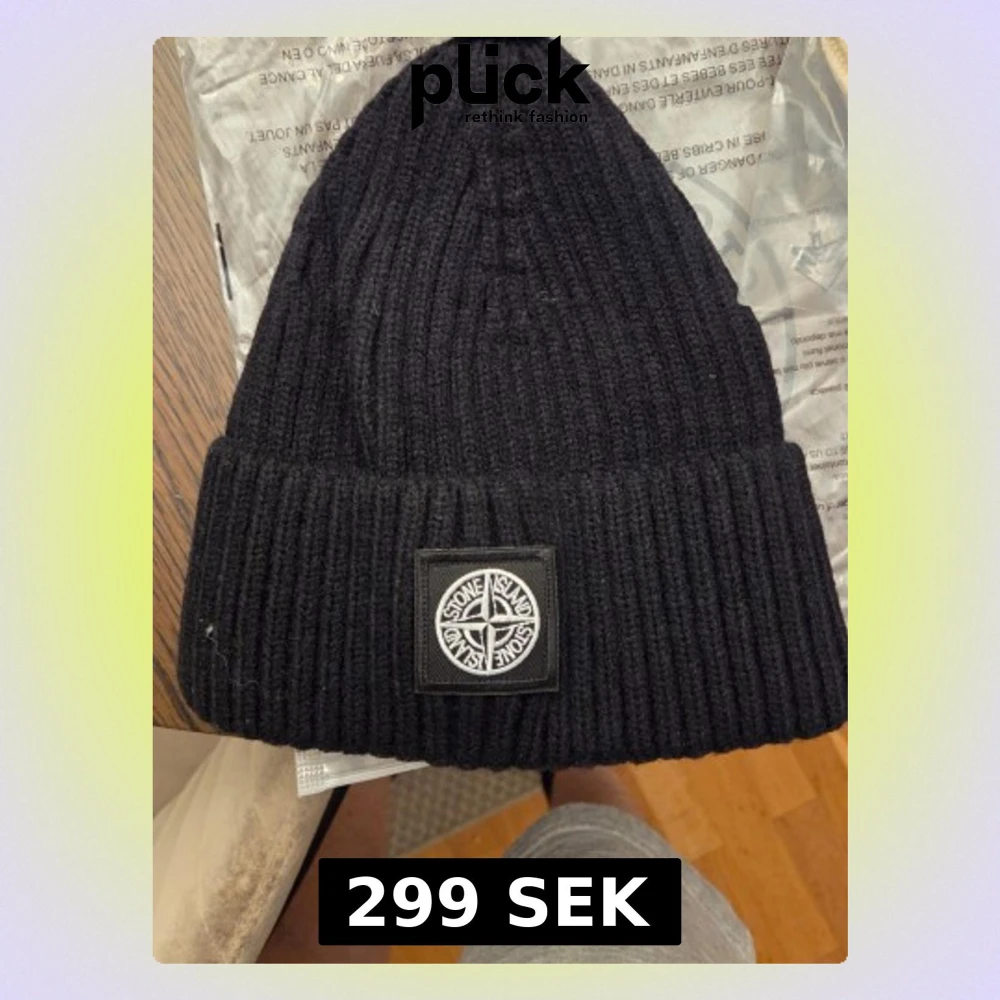 Säljer en svart ribbstickad mössa från Stone Island med klassisk logopatch framtill. Mössan är mjuk och har en uppvikt kant för extra stilpoäng. Perfekt för dig som vill ha en clean och snygg look under kalla dagar.