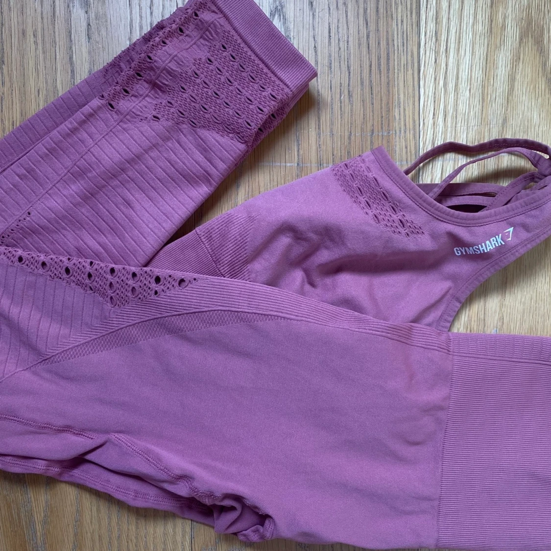 Gymshark set i färgen dusky pink. Storlek M i både underdel o överdel. Bra skick, då det knappt kommit till användning.
